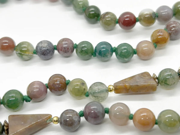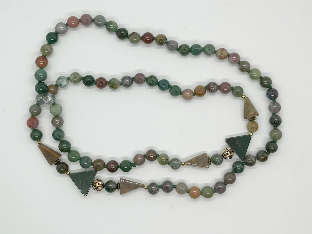 This is a beautiful set of necklace and earrings made of glass beads in a variety of shades,hand-knotted with emerald green thread. The pierced earrings have round and triangular shaped drops. The necklace is 30" and is made of round and triangular beads, accented with gold openwork beads. The earrings are for pierced ears and are post. The measure 2" long. The beads are in shades of green, purple, red and dark tan, and they are just beautiful. Glass.