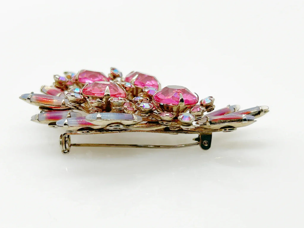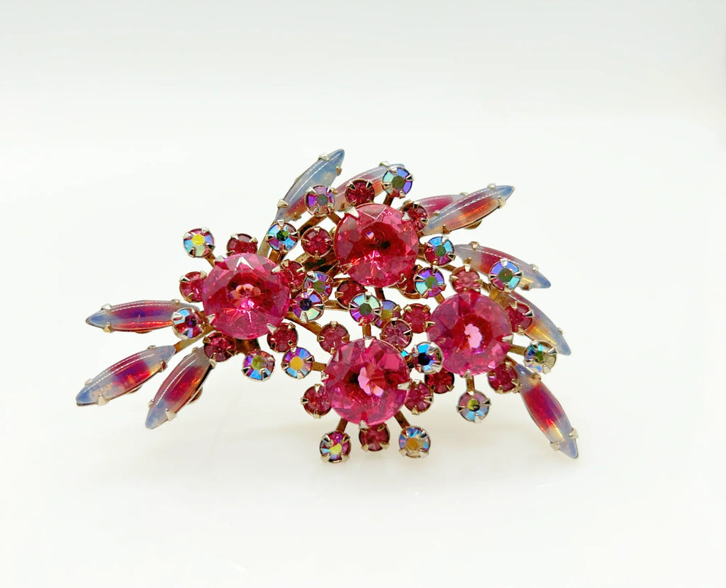 Add a touch of unique style and vibrance to any outfit with this stunning vintage pink brooch. Featuring a captivating design of four layers and various shades of pink stones, including a vibrant round faceted pink stone at the center of each section. It is surrounded by round pink iridescent and vivid stones, as well as several striped watermelon marquise cabochon stones for a unique finishing touch.