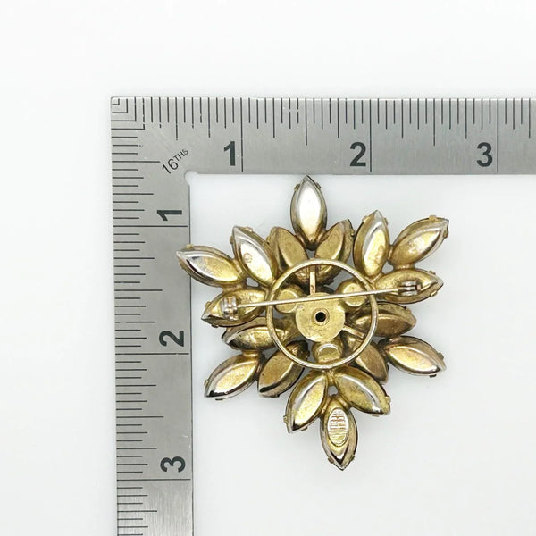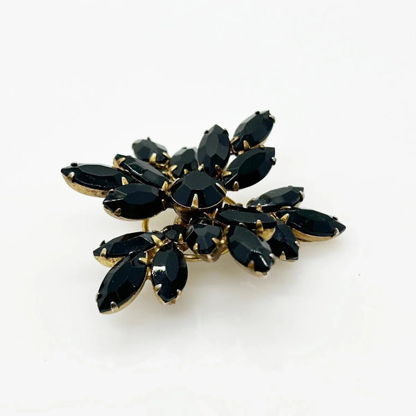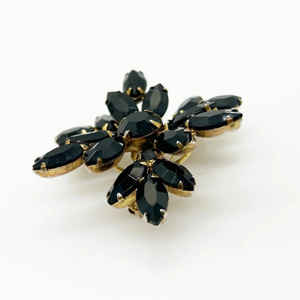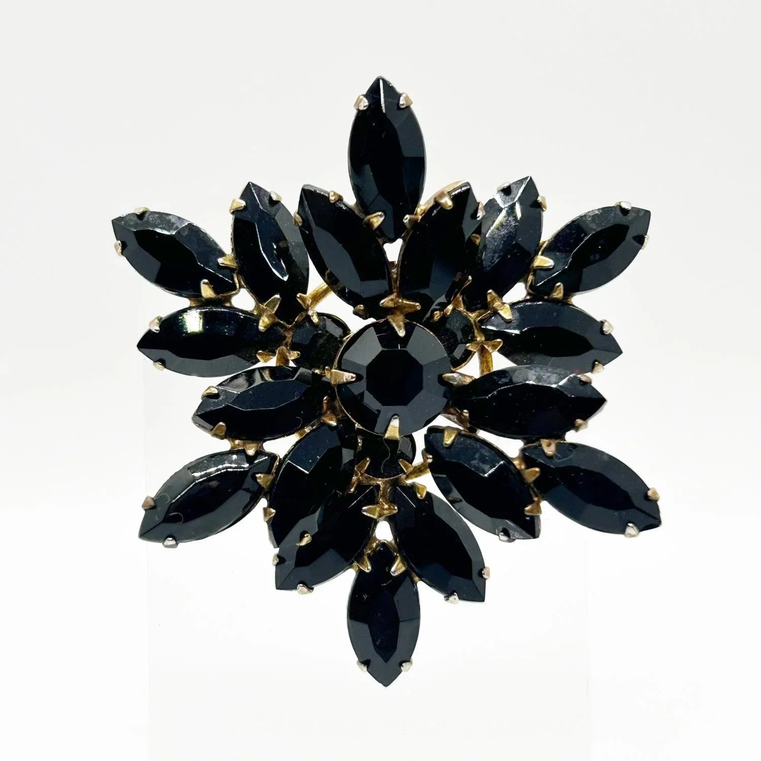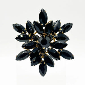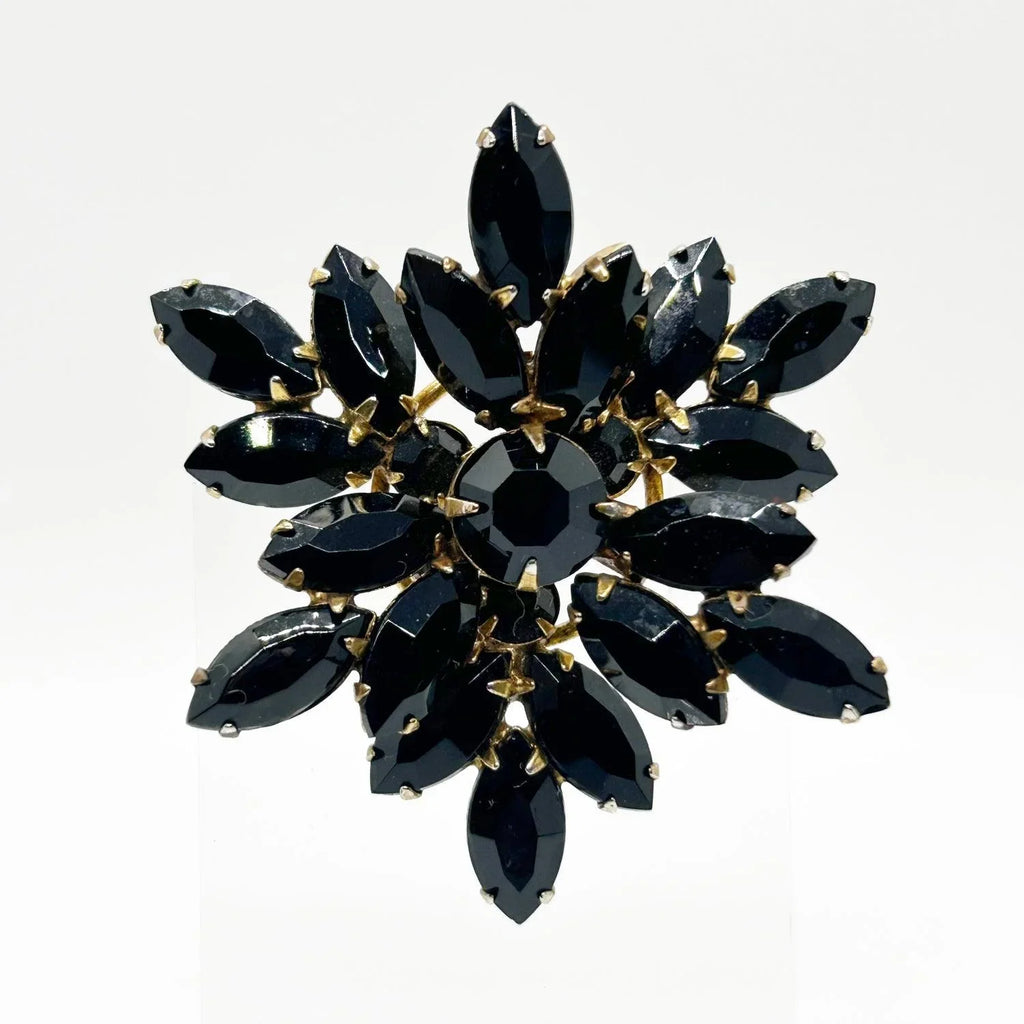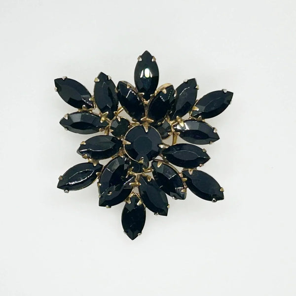 Elevate your style with the REGENCY Vintage Layered Black Stone Brooch. The intricate design features a variety of expertly cut stones displayed on shimmering gold tone metal. Measuring at 2 1/4" in diameter, this brooch adds a touch of sophistication to any look. Own this excellent find in excellent condition today!