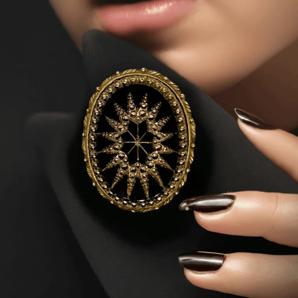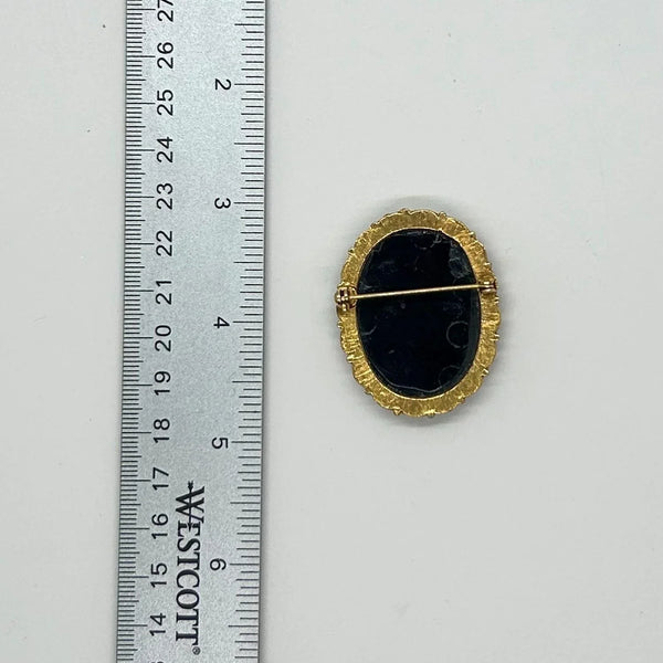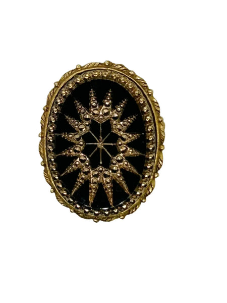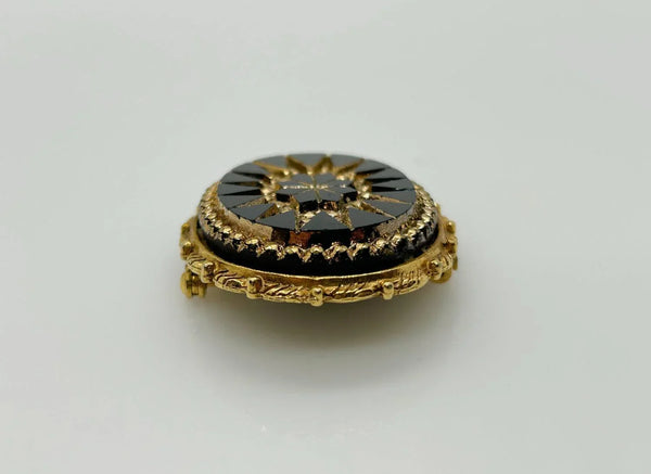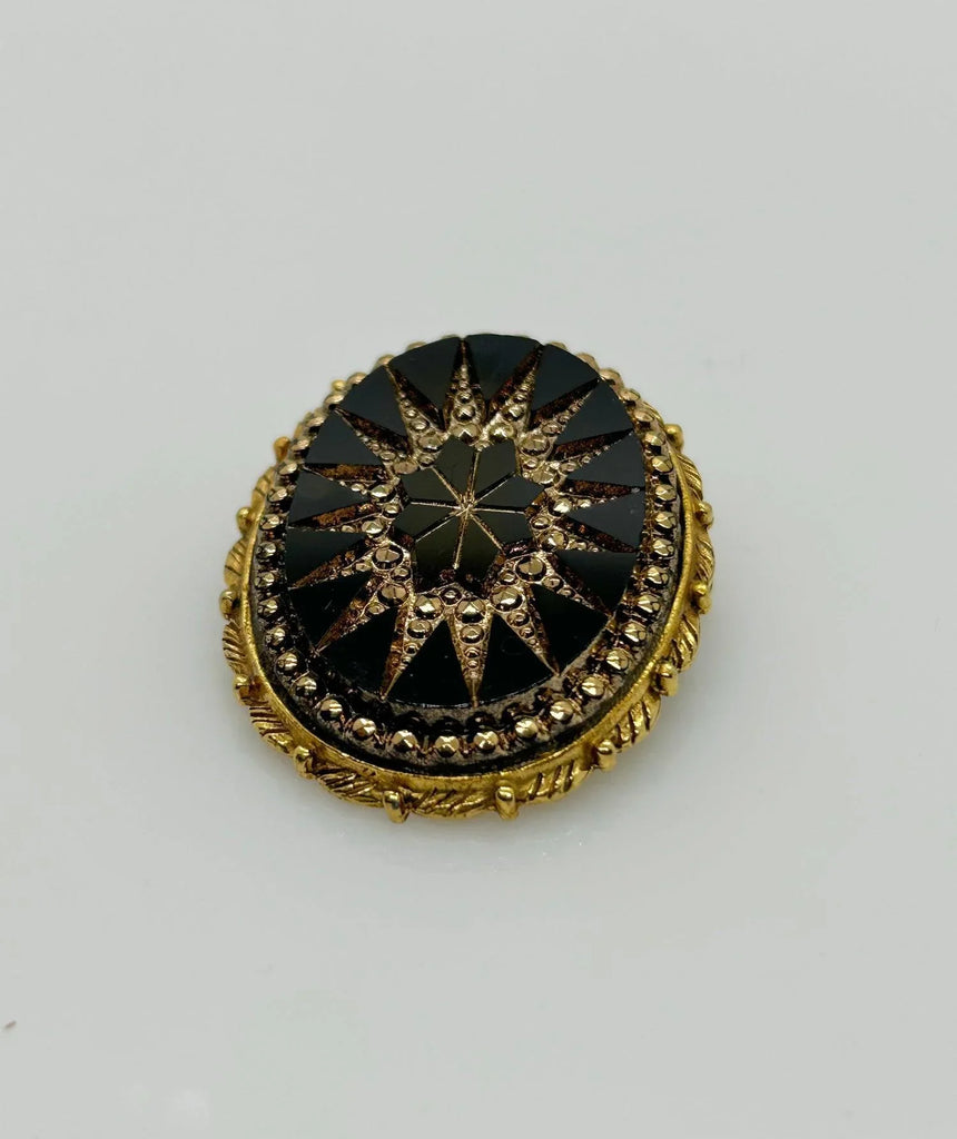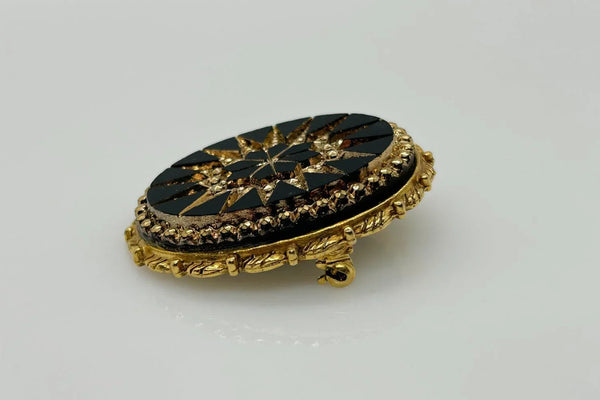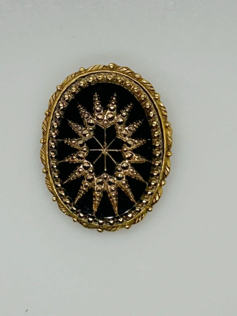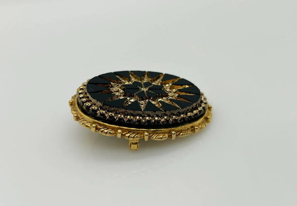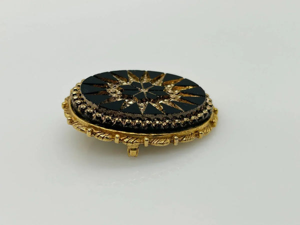 Unleash your inner fashionista with our exquisite oval vintage brooch! With its stunning geometric star pattern in rich black and gold mosaic, this brooch is a true statement piece. And with two luxurious gold tone frames - one resembling a ballpoint and the other a rope - this brooch is both elegant and unique. At just under 2 inches tall, it's the perfect size to add a touch of vintage glamour to any outfit. In excellent condition, this brooch is sure to become a beloved addition to your jewelry collection. Don't miss out on this exquisite and one-of-a-kind piece!