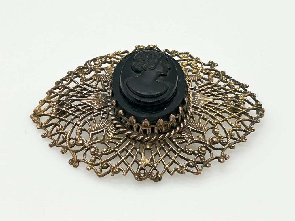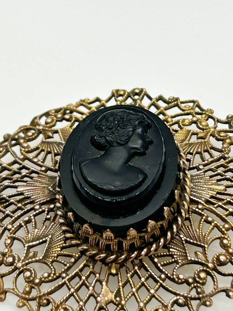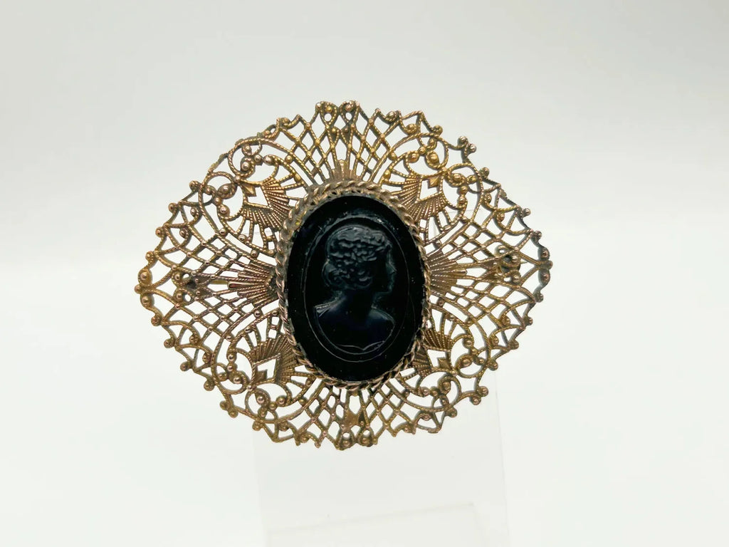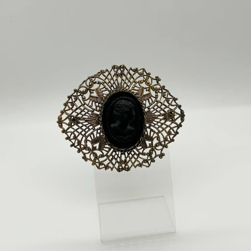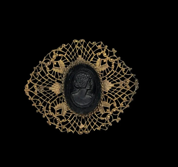 This is a remarkable brooch. At the center is an oval cameo in black stone, showing a female figure. It is held in place by elaborate prongs and sits on an intricate metal lacework frame. The back is as spectacular. In whole, the brooch measures 3” across and 2.5” tall. Free Shipping