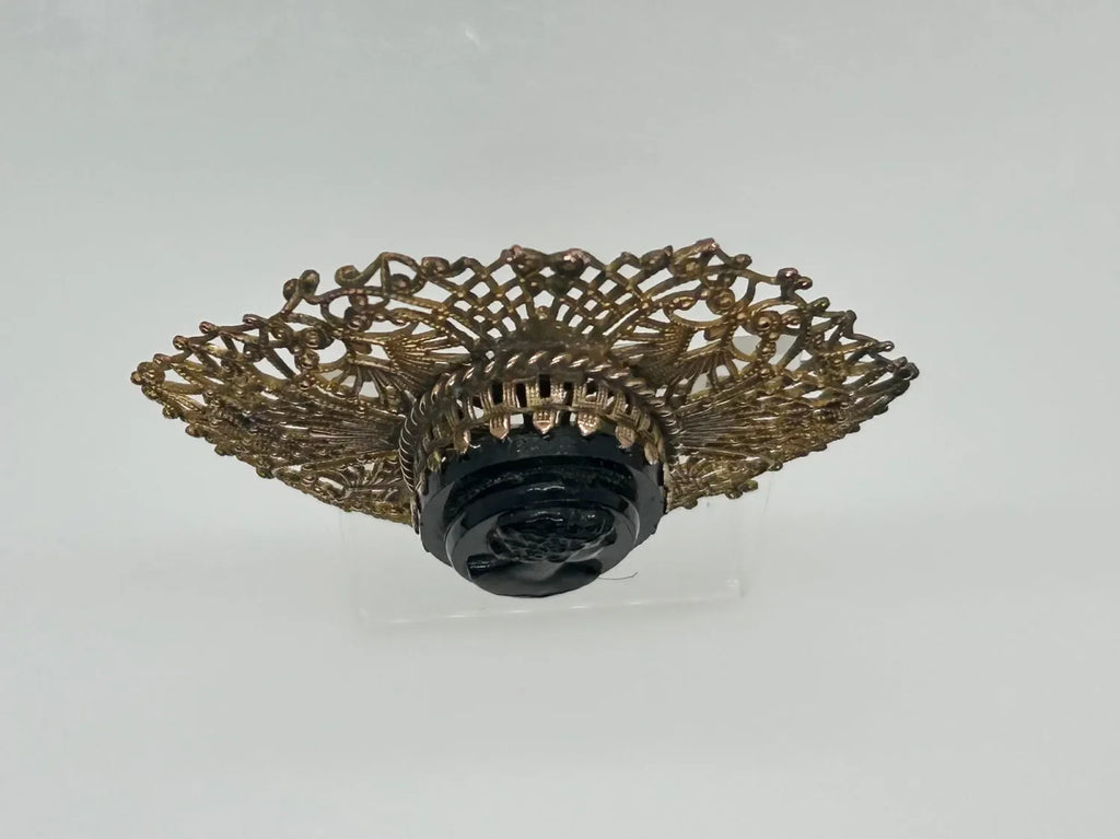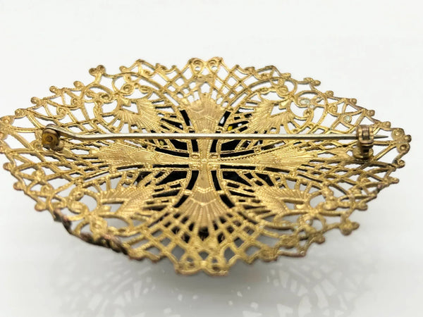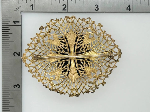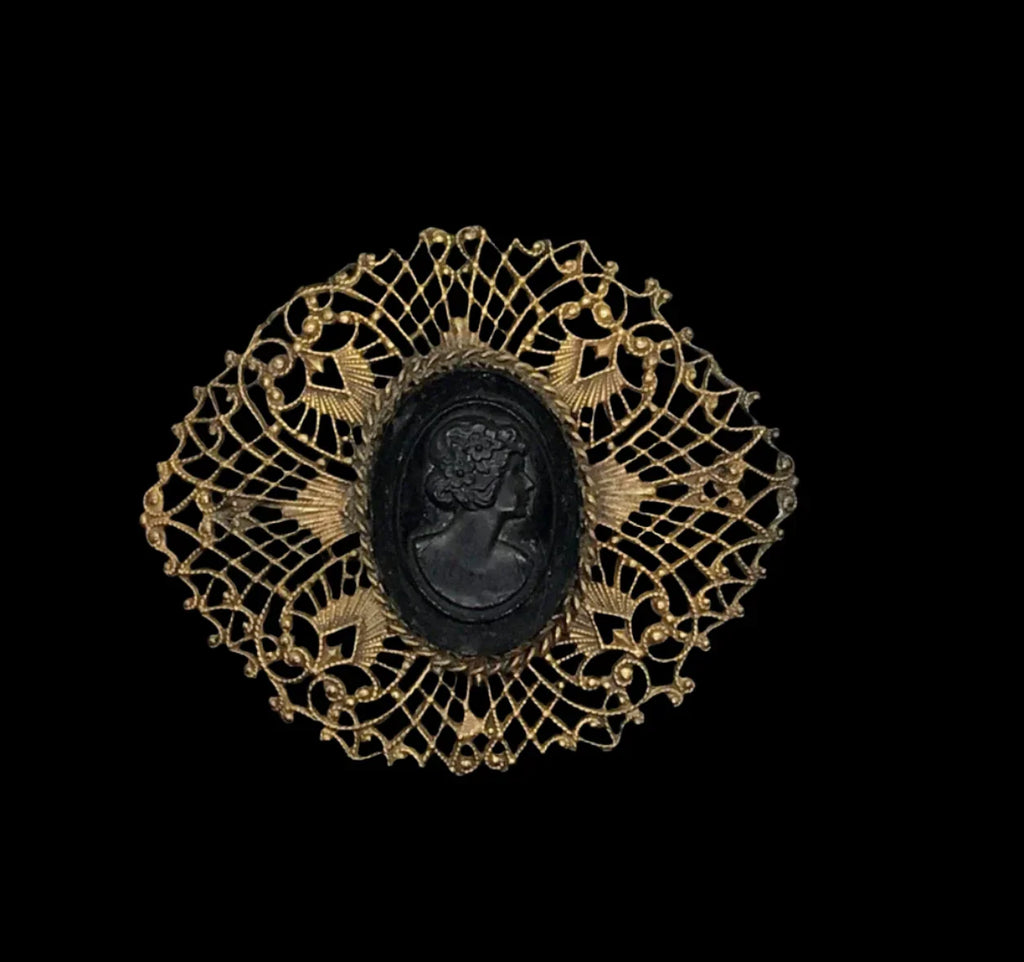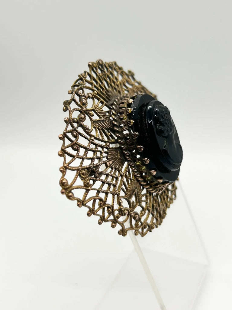 This is a remarkable brooch. At the center is an oval cameo in black stone, showing a female figure. It is held in place by elaborate prongs and sits on an intricate metal lacework frame. The back is as spectacular. In whole, the brooch measures 3” across and 2.5” tall. Free Shipping