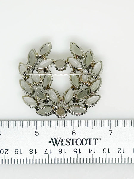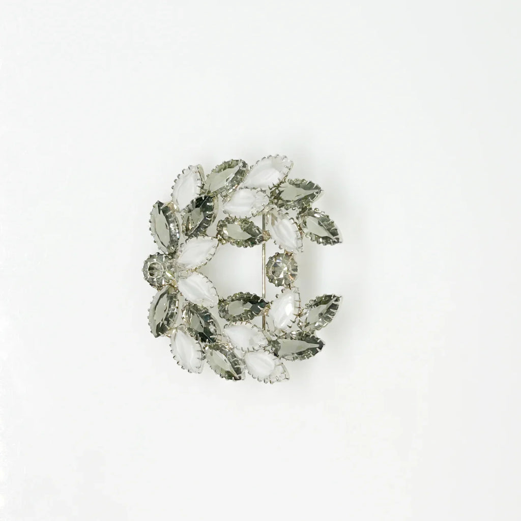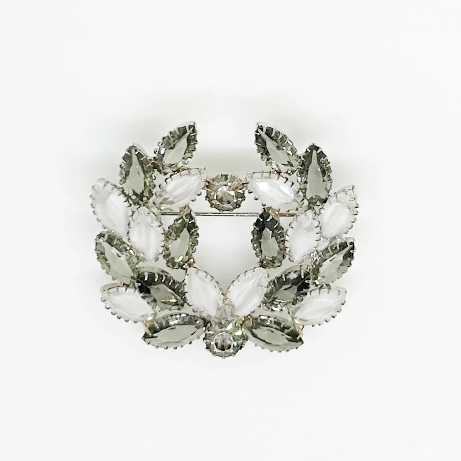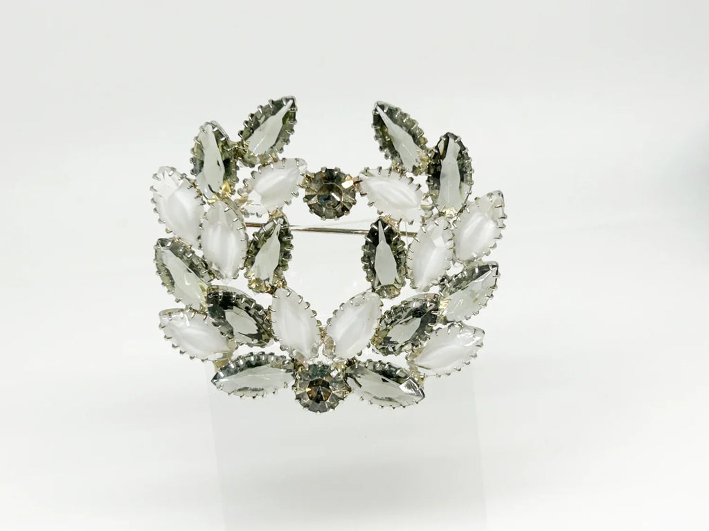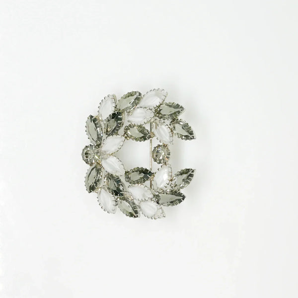 This exquisite brooch showcases stunning marquise stones in various shades of gray and silver, perfectly accented with small shimmering rhinestones. Measuring at 2.25” wide and set in a sleek silver tone, this brooch is a true beauty. The unique open-backed design adds an extra touch of elegance, however, some of the white stones may show signs of wear at the top. Free Shipping