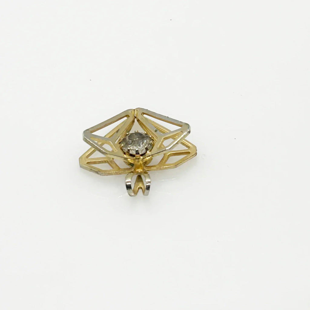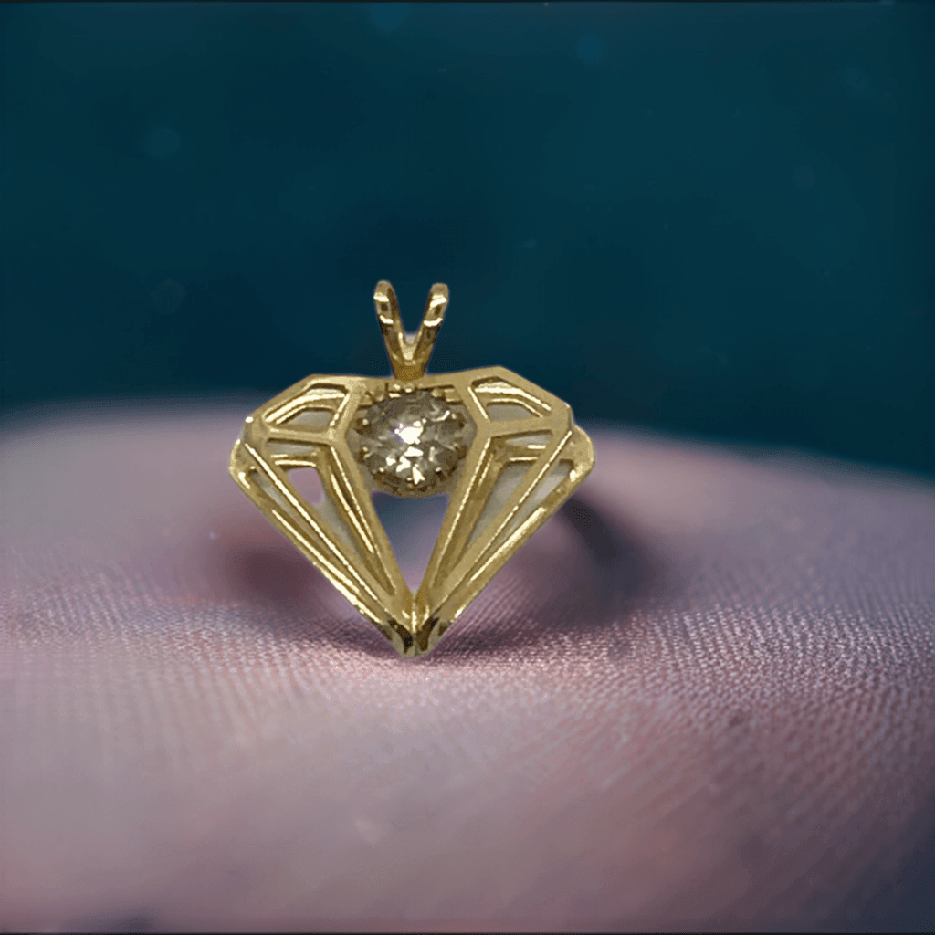 Constructed with a gold metal setting and a round rhinestone, this vintage, diamond-shaped pendant displays a three-dimensional design and measures approximately one inch in width. In pristine condition. Add a touch of elegance to your outfit with this timeless, vintage pendant featuring a stunning round rhinestone in a classic diamond shape. The three-dimensional design and intricate gold metal setting make it a truly unique piece. Perfect for any occasion, this pendant measures approximately 1" inch in width and is in good condition. The chain is included so that you can wear it or gift it immediately. Add to your style with this one-of-a-kind accessory!