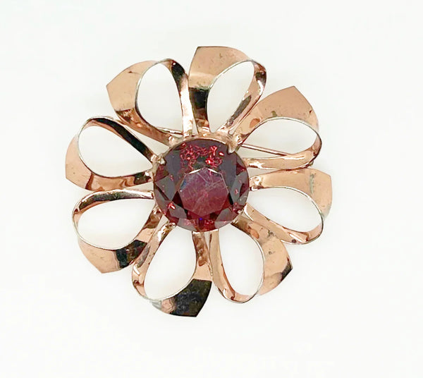Add a pop of color to any outfit with this stunning gold wash sterling vintage floral brooch! The eight shiny ribbon petals gracefully surround a large round faceted stone that can appear red or even root beer depending on the light. And at 2.5" across, this marked sterling brooch is sure to make a great impression. Plus, with minimal signs of metal wear, it's the perfect accessory to elevate your look. Free shipping!