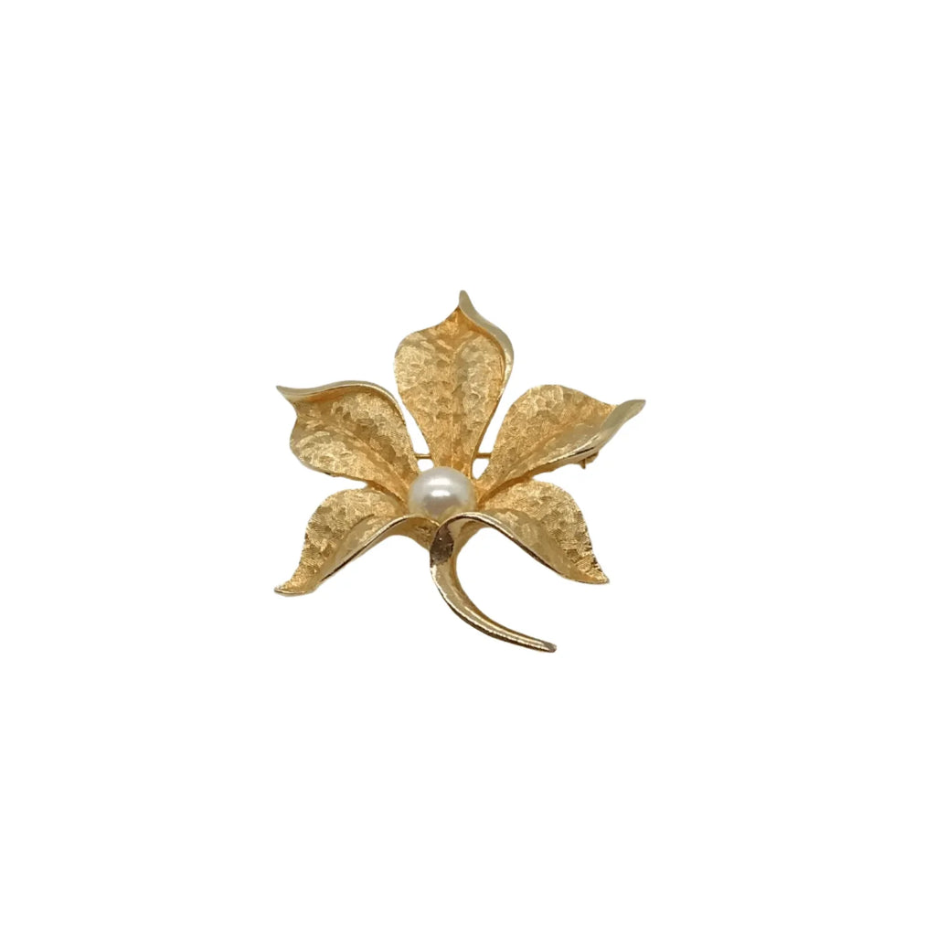 This beautiful leaf brooch has a rich textured surface and is set with a bright clear simulated pearl. It measures 2" tall and is in very good condition. Elevate your style with this stunning Vintage Textured Gold Leaf Brooch. The intricate surface and luminous simulated pearl exude elegance and sophistication. At 2" tall, it's the perfect statement piece for any occasion. With its impeccable condition, this brooch is sure to add a touch of luxury to your wardrobe.