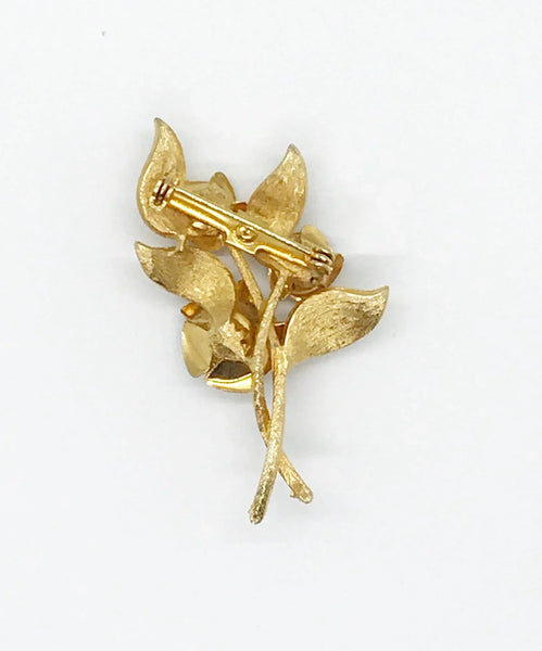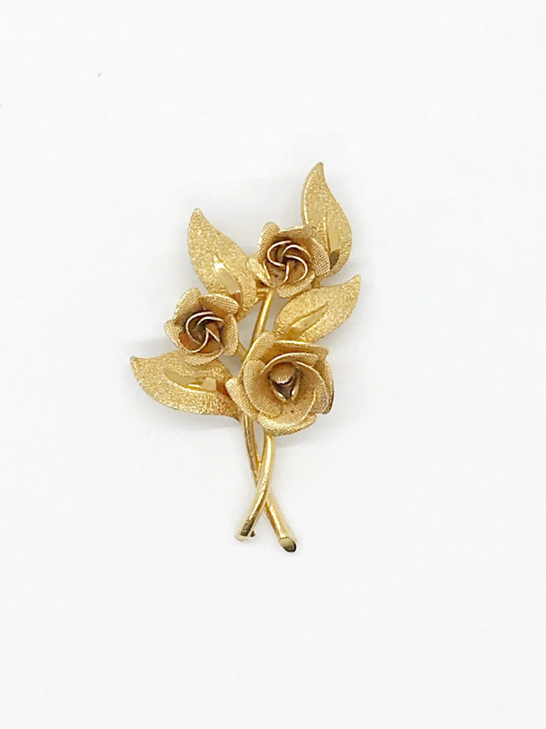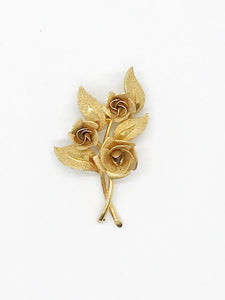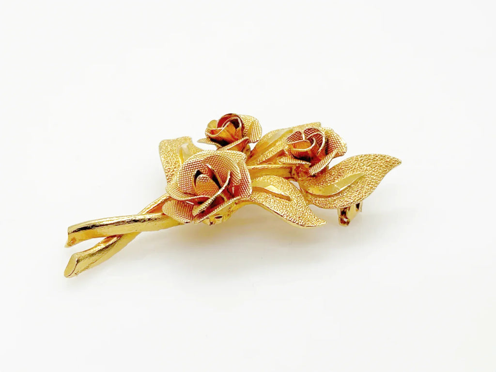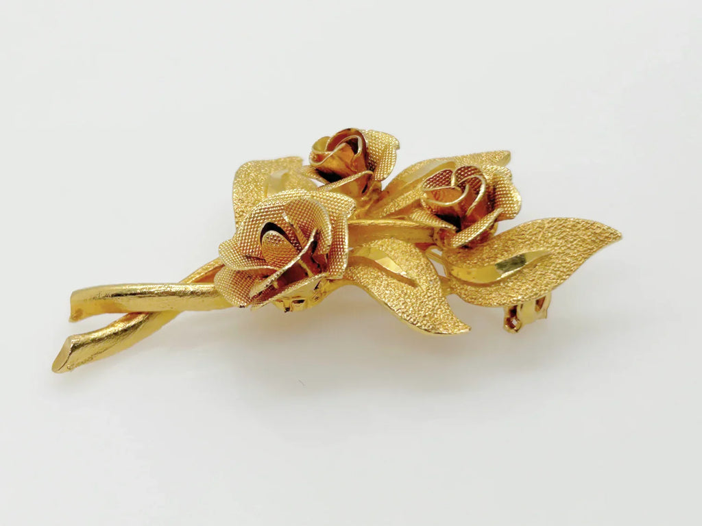 This stunning brooch features three delicate rose blossoms in the midst of blooming. The intricate textures of the petals and leaves add a special touch to its design. You can admire the lifelike beauty and impeccable details of this expertly crafted piece. In a gorgeous gold tone, this brooch stands at 2.25 inches tall and is in pristine condition.