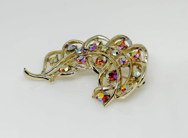 This vintage feather brooch, crafted from gold-tone metal, is adorned with aurora borealis rhinestones in a captivating golden-red color. The feather-inspired design is delicately displayed, reflecting light and highlighting the striking stones. Measuring 2 3/4" in length, this brooch is in very good condition, making it a truly special accessory.