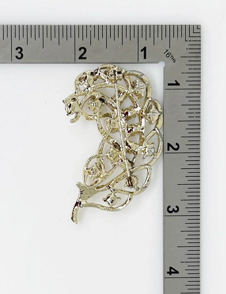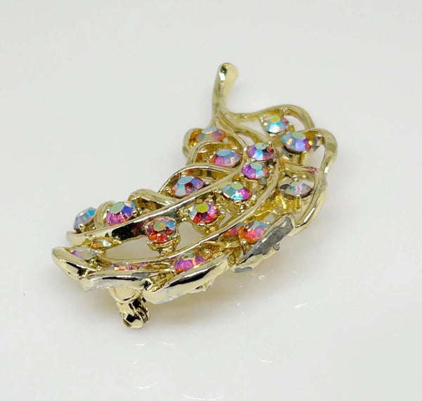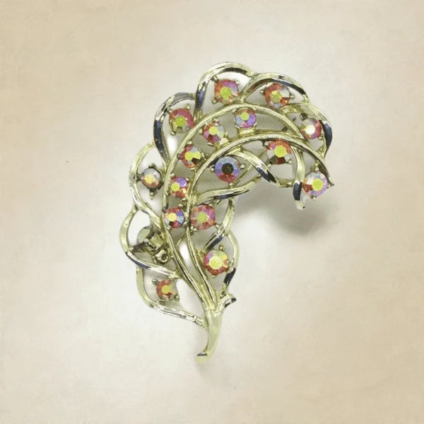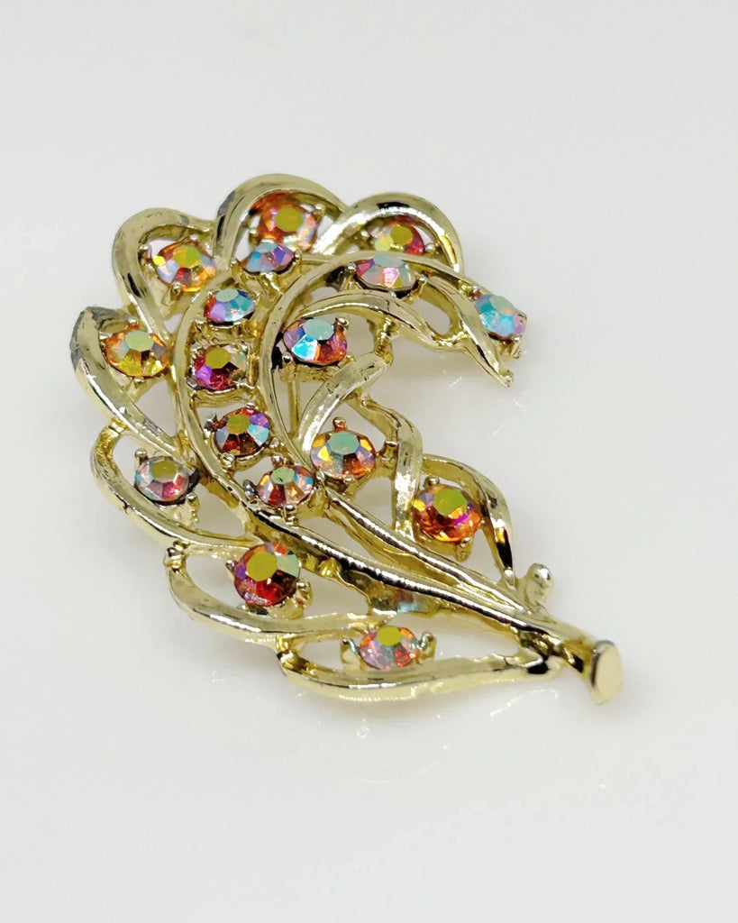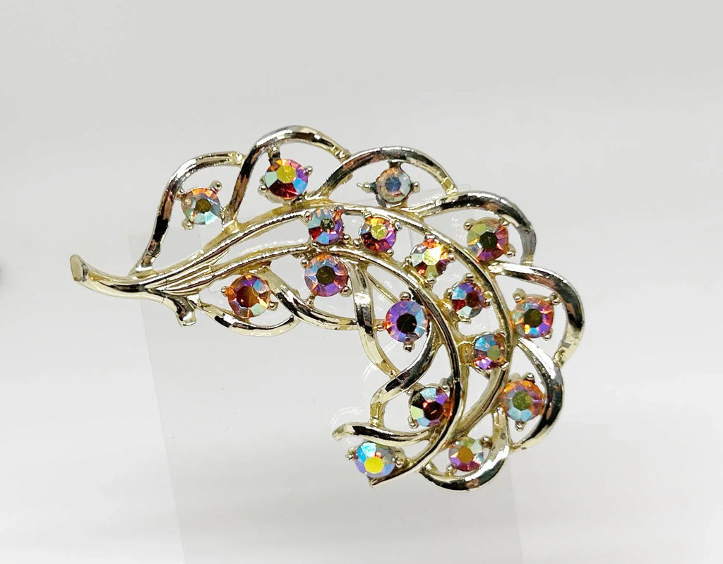 Vintage Feather Brooch with Iridescent Golden Rhinestone Detail