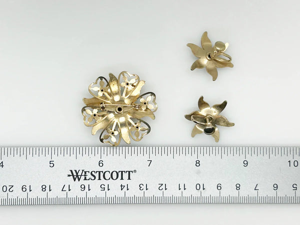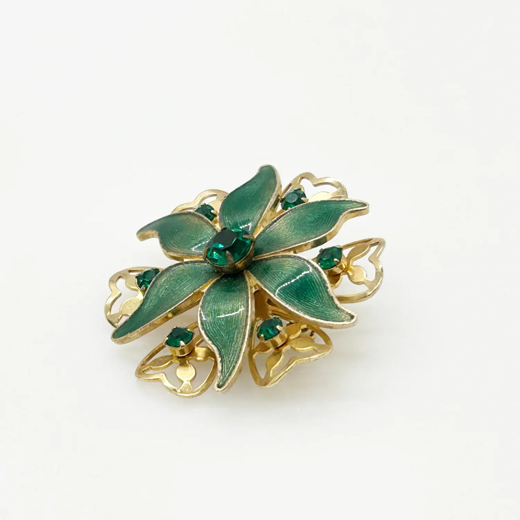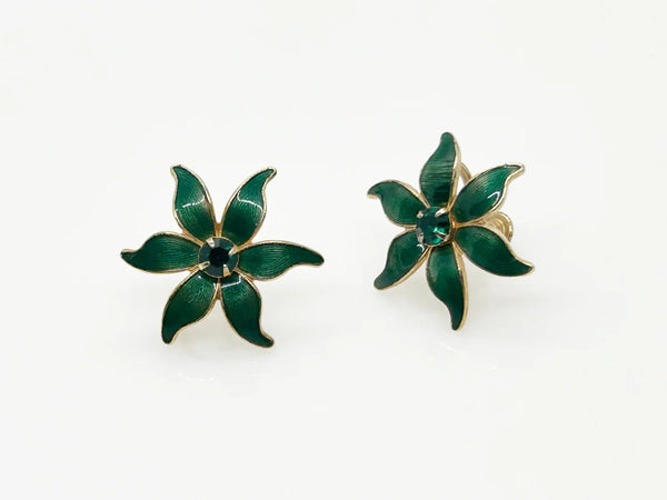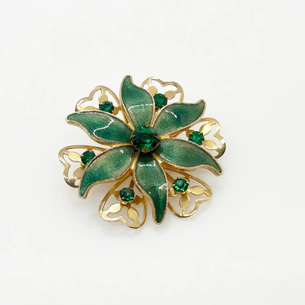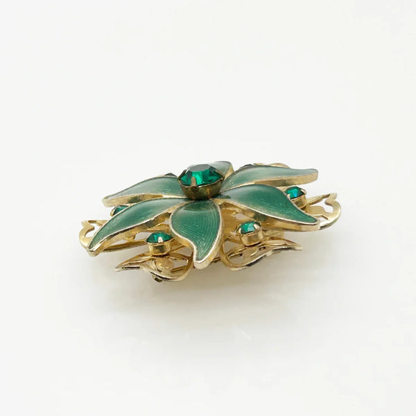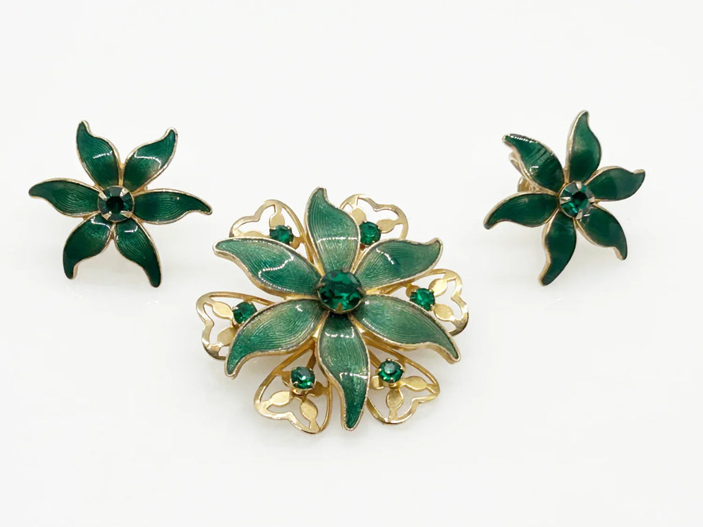 Vintage Green Enamel and Rhinestone Floral Brooch and Earrings