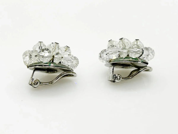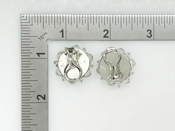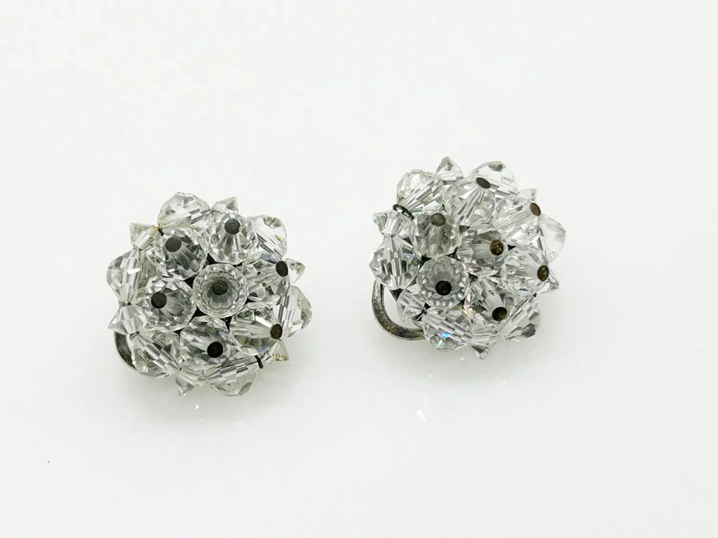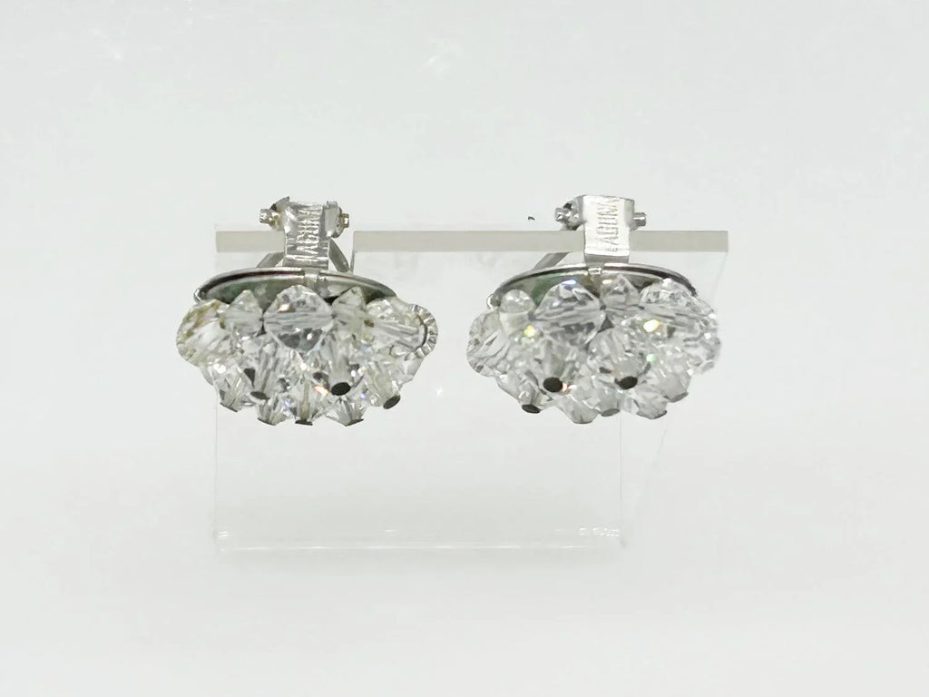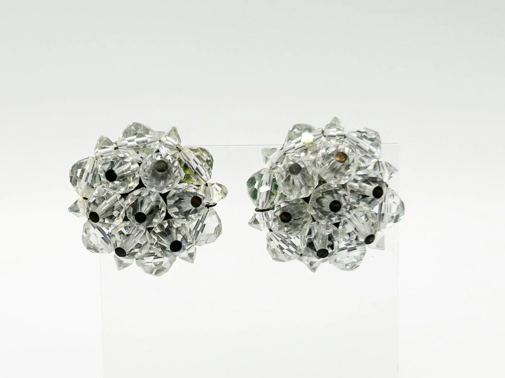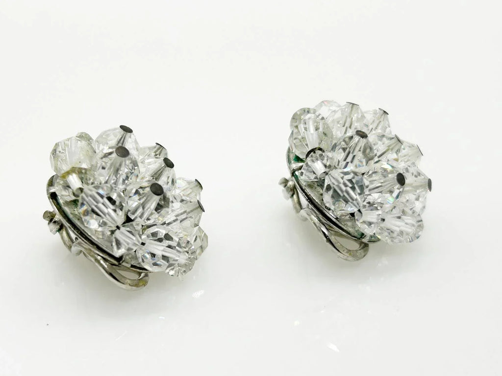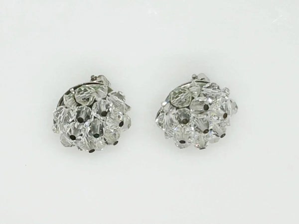 This is an eye catching pair of vintage Laguna clip on earrings, made of sparkling clear crystals beads hand wired into a 3-d round shape in silver tone metal. They each measure about .75" and are in excellent condition. They are signed Laguna on the hinge.