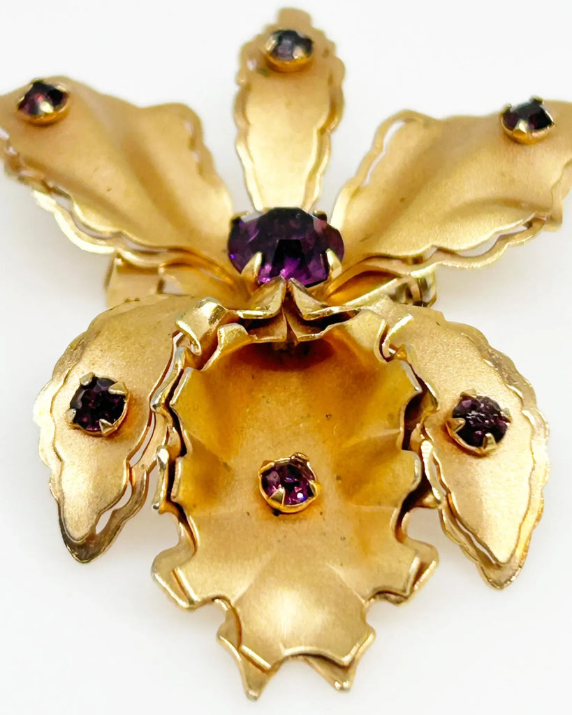 Here is a beautiful vintage orchid brooch with lovingly detailed metal and small, round purple rhinestones, which are prong set. There are layers to the brooch, which add to the exquisite detailing. In the center of the flower is a larger purple stone, with excellent clarity. It measures 2.25” and is in very good condition.