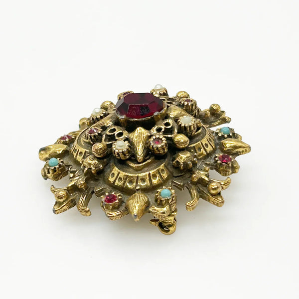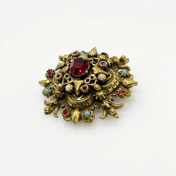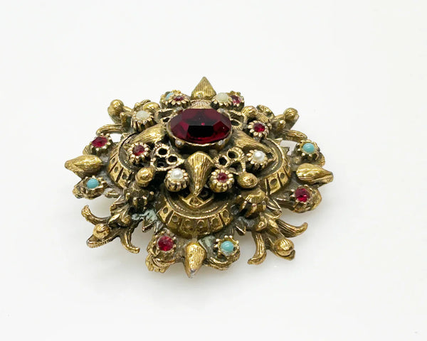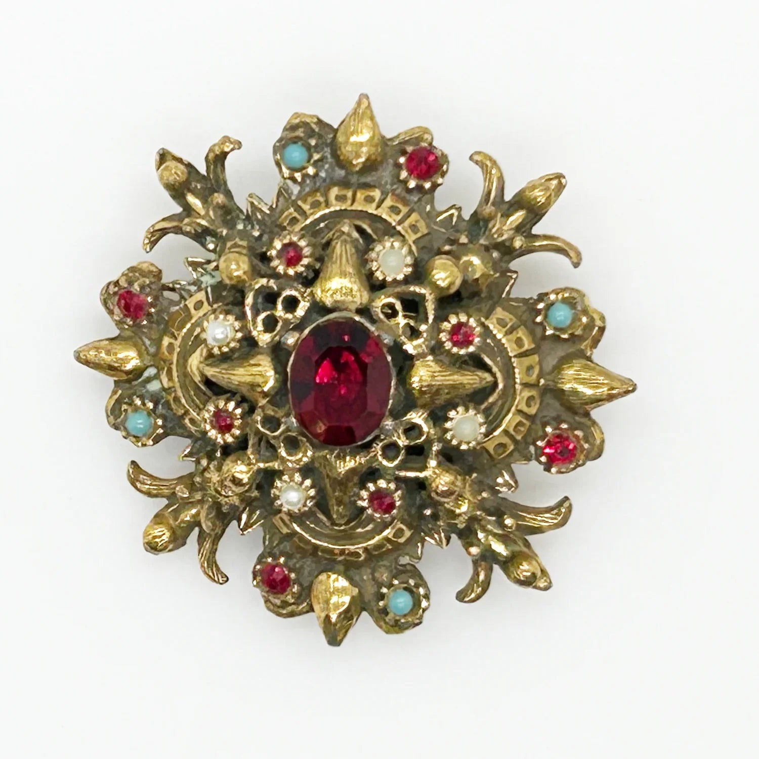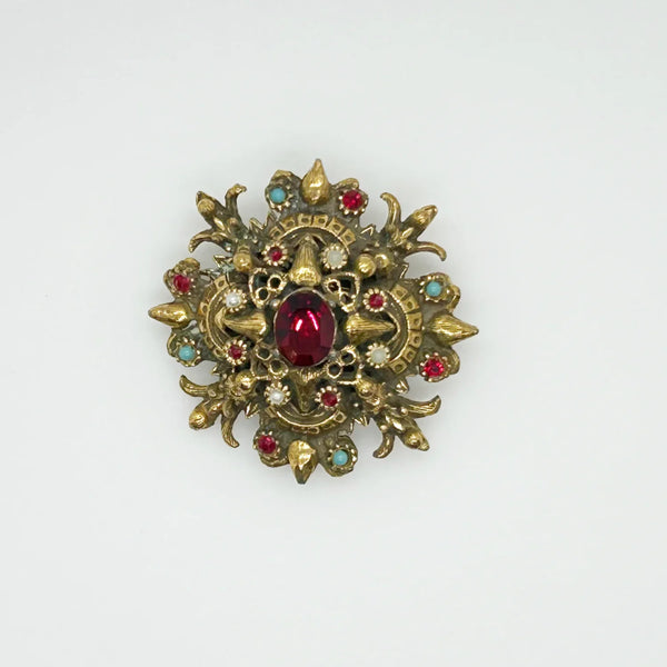 This beautiful brooch reminds me of one a royal personage would wear on a sash as a member of The Order of Pedigreed Estate Owners or some such. It has also reminded me for years of a piece by ART. It is made of antiqued gold tone metal, set with tiny faux turquoise and pearls, with a large faceted oval ruby red stone in the center. The reverse is nicely worked as well. It is layered and three dimensional, measuring about 1 3/4" in each direction. I see some white on the reverse, everything else is perfection.