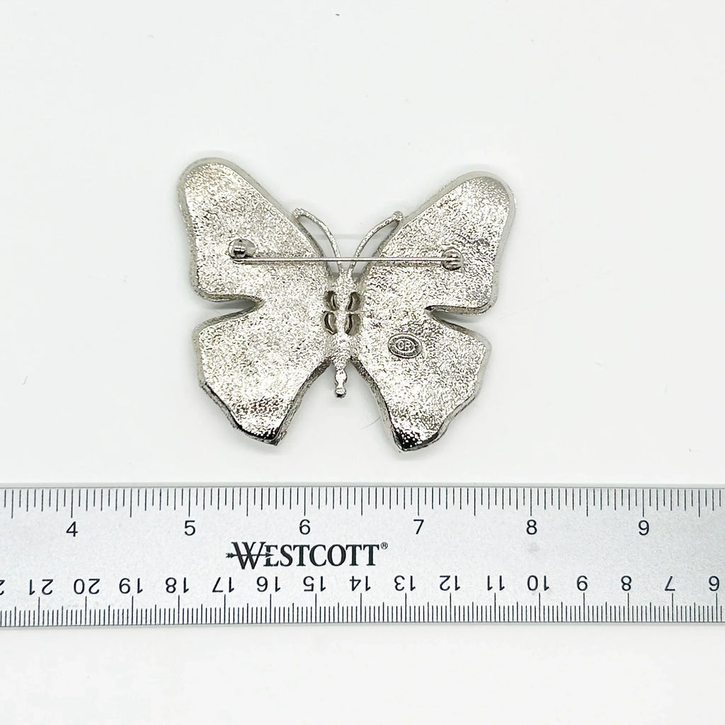 This remarkable vintage butterfly brooch is adorned with resplendent golden rhinestones and expertly crafted to impress. Its substantial silver tone metal only adds to its finesse, making it an essential addition to your accessory collection. Signed by the masterful "OR" in bold block letters, this piece measures a sizable 3" wide and 2.5" tall. Free Shipping