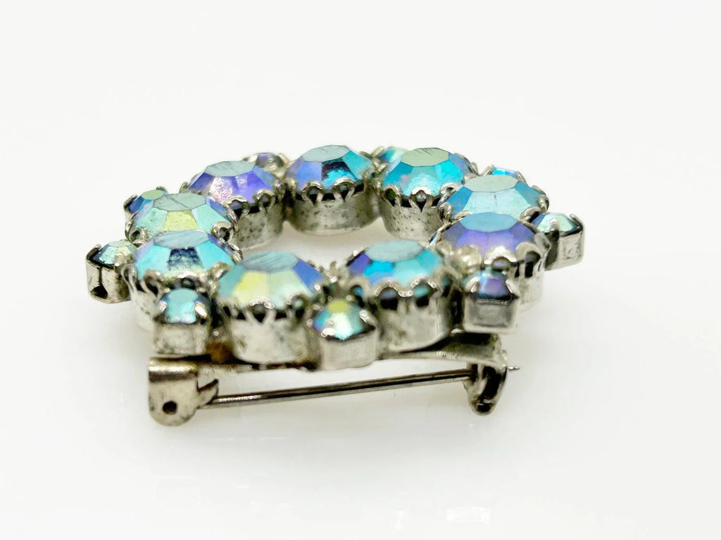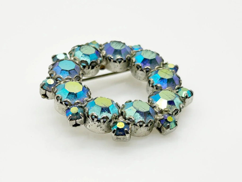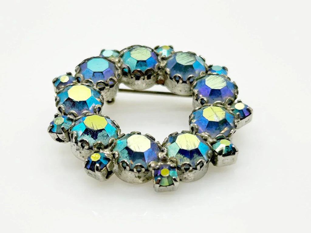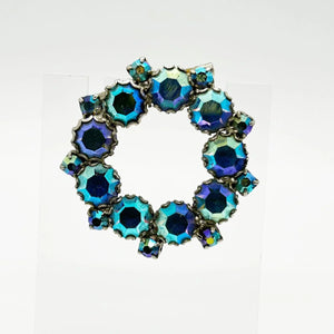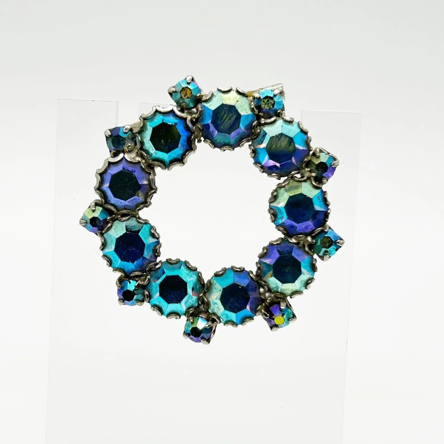 This exquisite round brooch features a timeless design adorned with shimmering iridescent stones in varying sizes. Measuring 1.5 inches in diameter, it remains in excellent condition. Add a touch of opulence to any outfit with this Vintage Iridescent Blues Circle Brooch. Exquisitely crafted with iridescent stones in varying sizes, this timeless design is a true statement piece. Measuring 1.5 inches in diameter, with cupcake setting, and in very good condition, it exudes elegance and sophistication. Perfect for elevating any ensemble, it's a must-have for any fashion-forward individual.