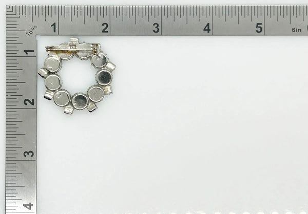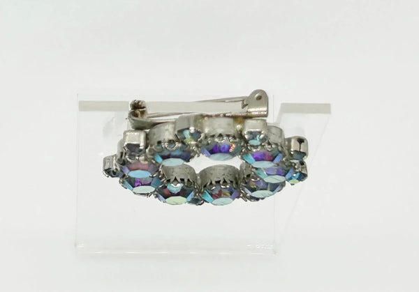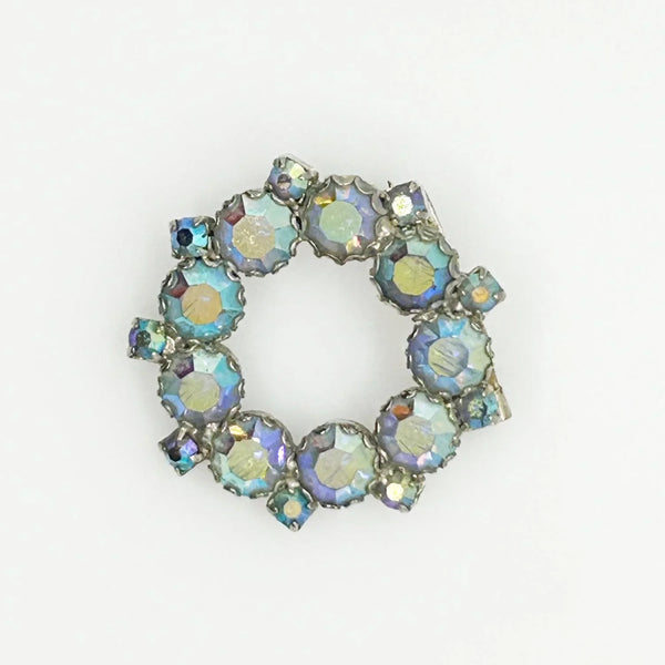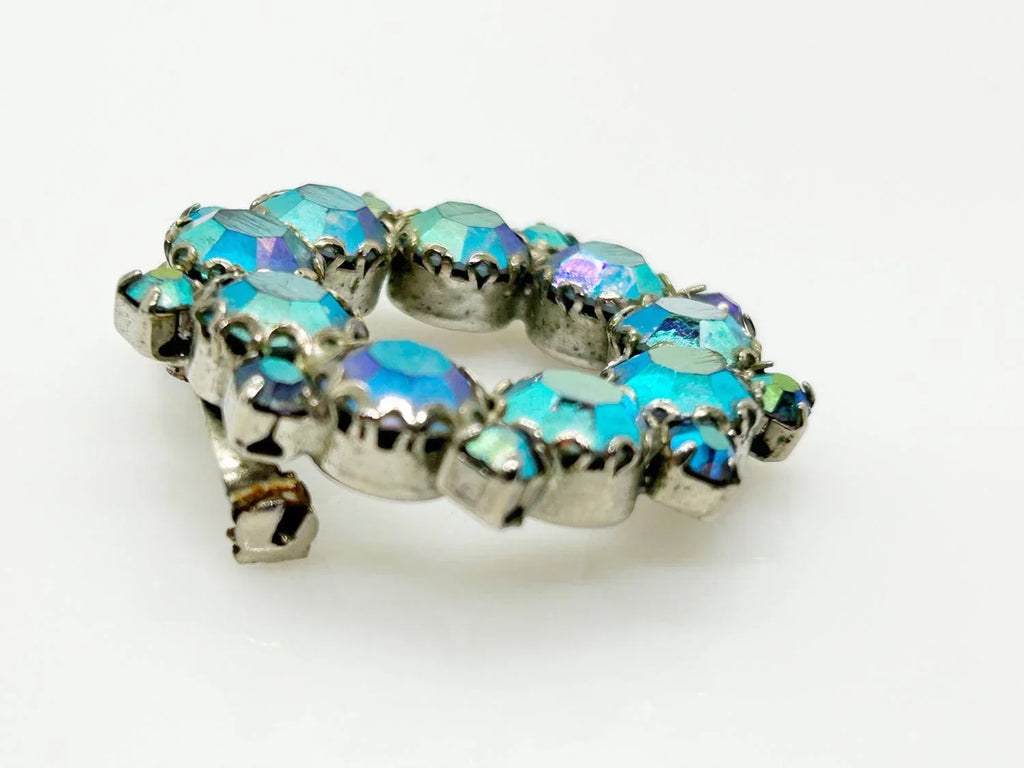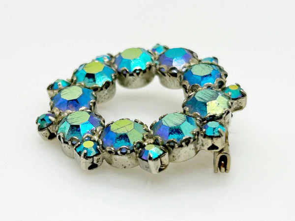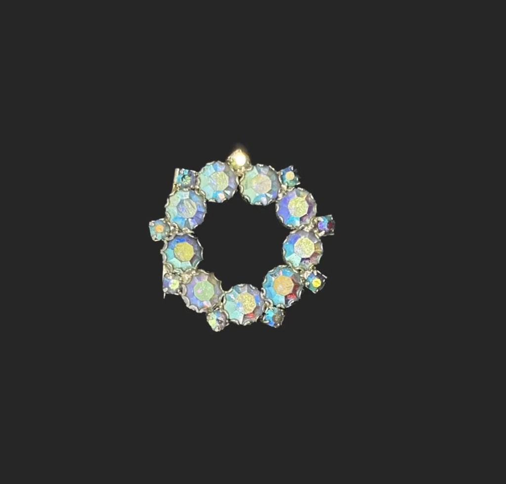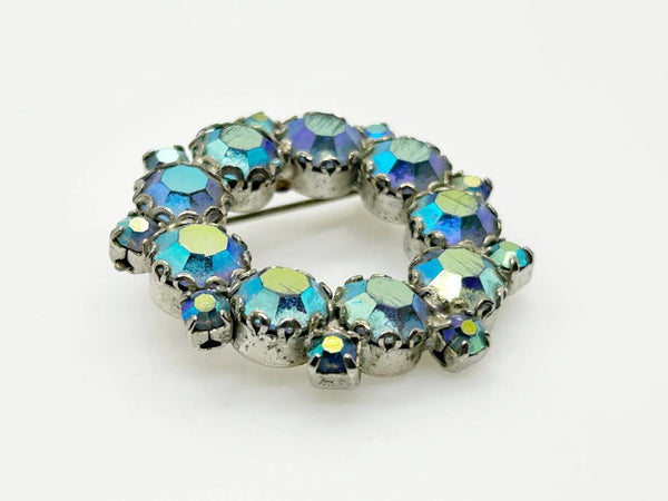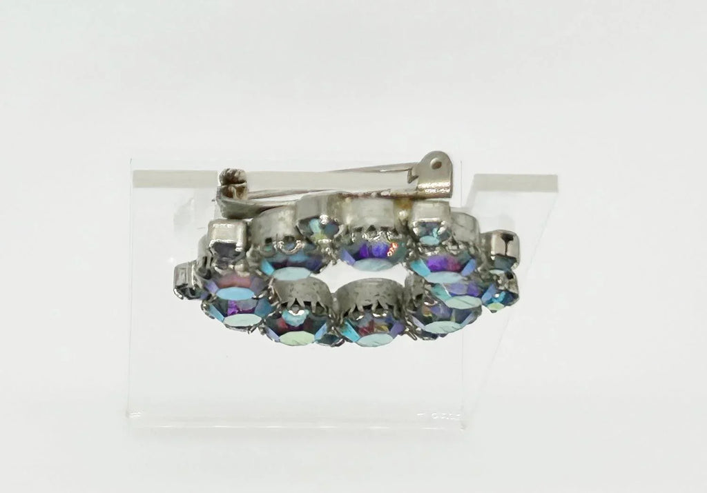 This exquisite round brooch features a timeless design adorned with shimmering iridescent stones in varying sizes. Measuring 1.5 inches in diameter, it remains in excellent condition. Add a touch of opulence to any outfit with this Vintage Iridescent Blues Circle Brooch. Exquisitely crafted with iridescent stones in varying sizes, this timeless design is a true statement piece. Measuring 1.5 inches in diameter, with cupcake setting, and in very good condition, it exudes elegance and sophistication. Perfect for elevating any ensemble, it's a must-have for any fashion-forward individual.