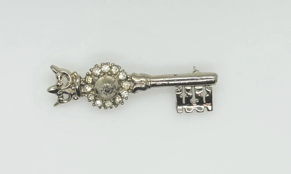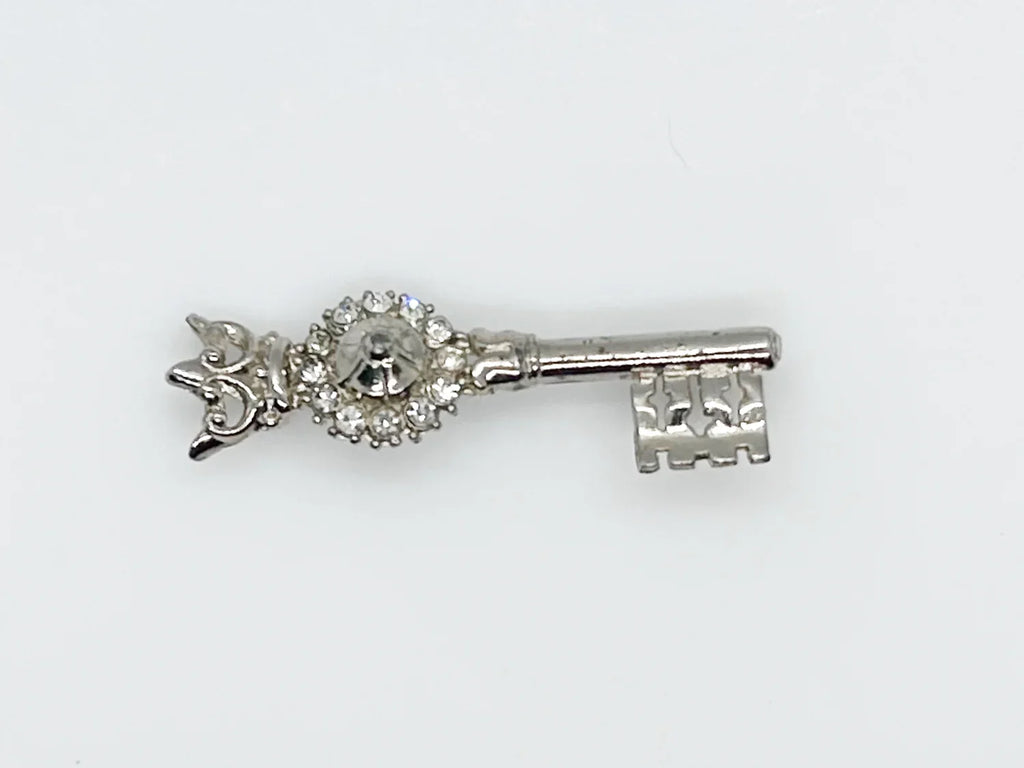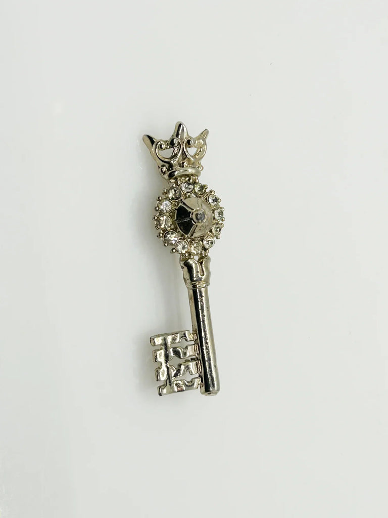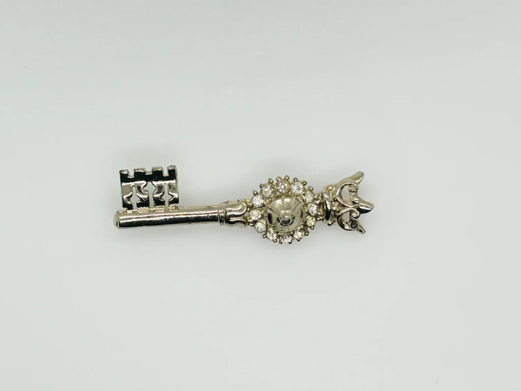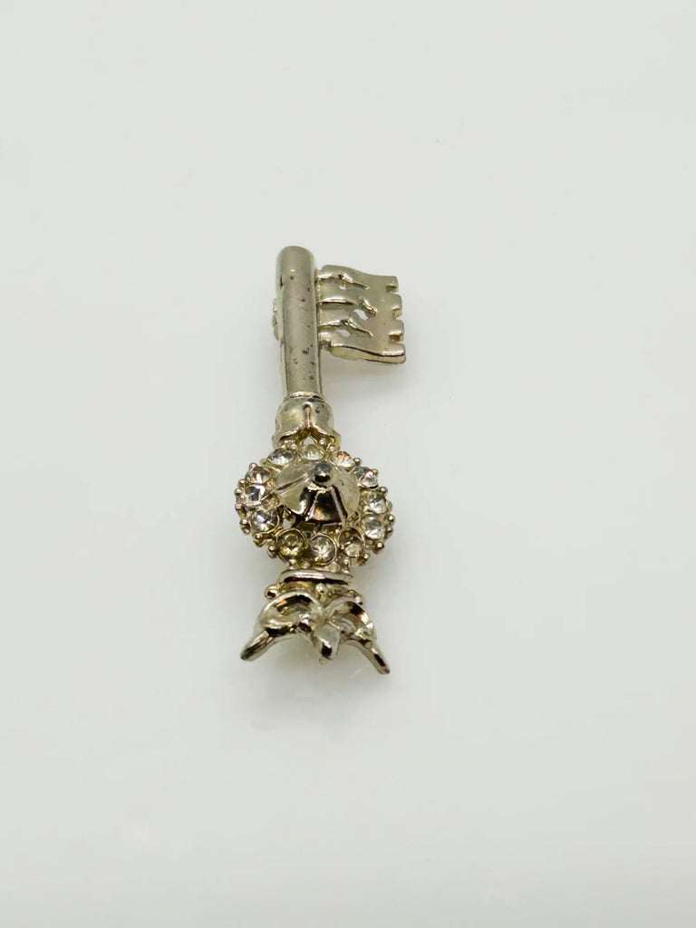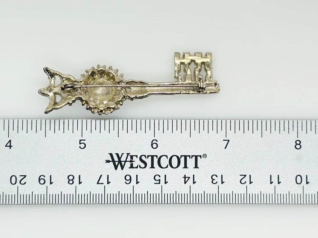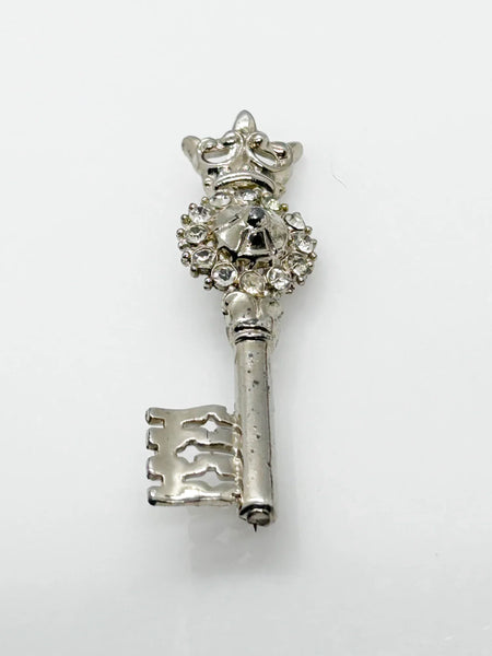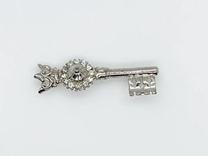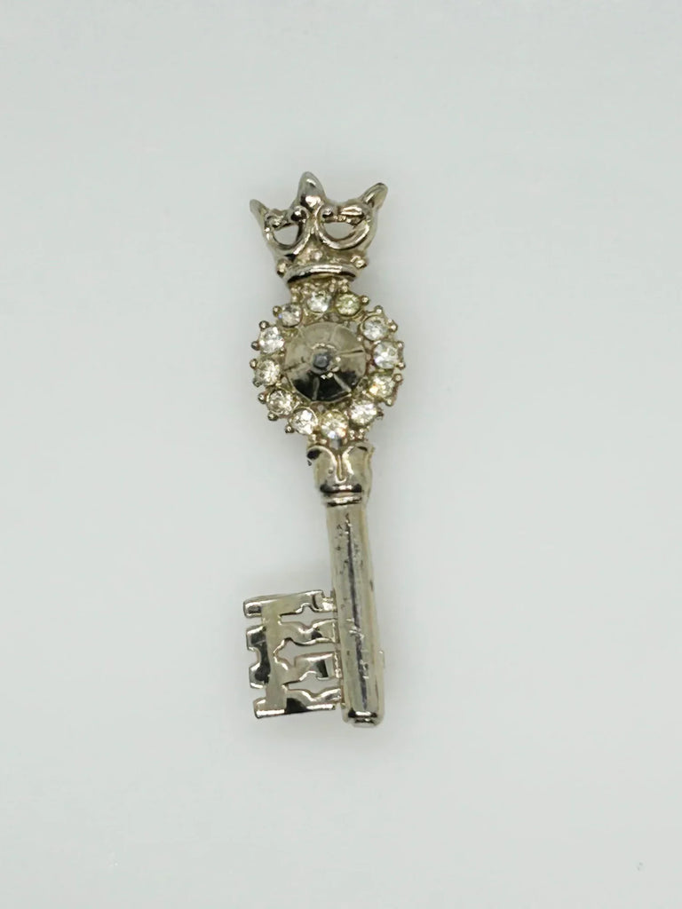 Feel like royalty with this vintage brooch designed in the shape of a key, adorned with a regal crown. Enhancing the elegance are a circle of round white rhinestones, giving it a touch of flair. Measuring 2 1/4" and in fair vintage condition, this brooch is the perfect addition to your collection.