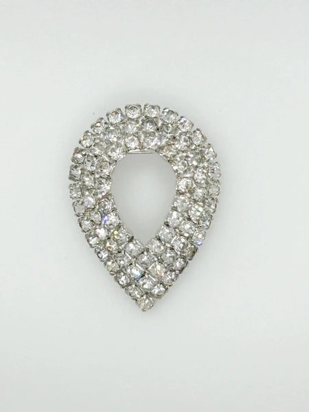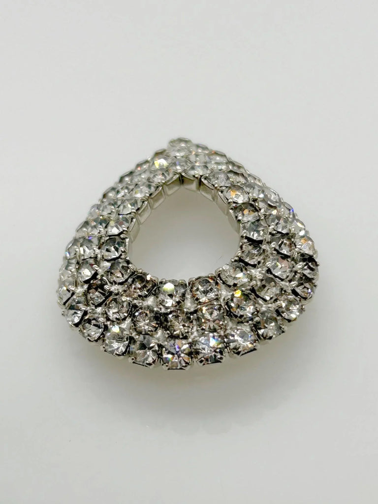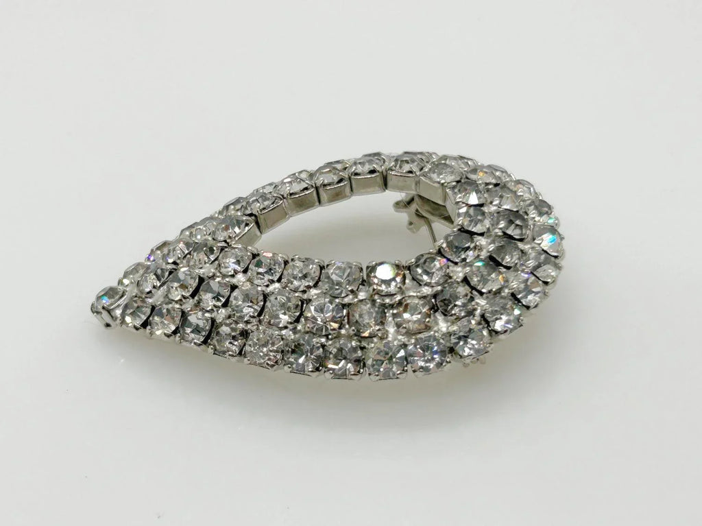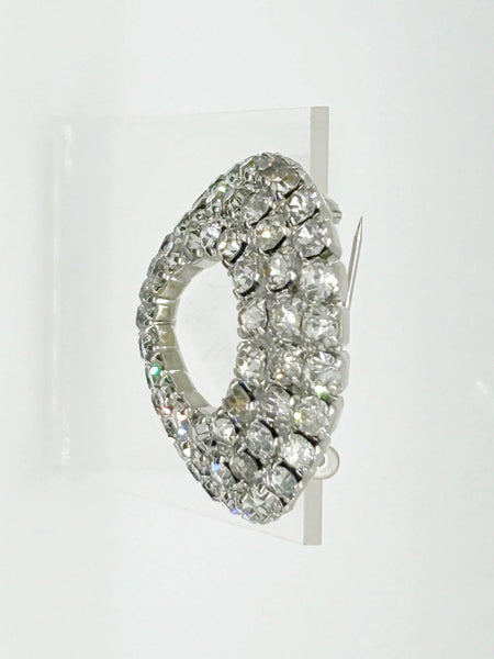 Capture the essence of timeless elegance with this exquisite vintage brooch featuring three dazzling rows of bright rhinestones expertly set in shimmering silver metal. Measuring 2 inches, this piece is in impeccable condition, making it a must-have addition to any jewelry collection.