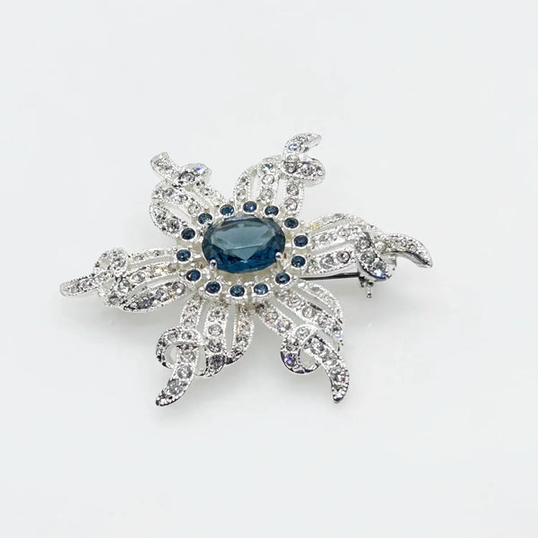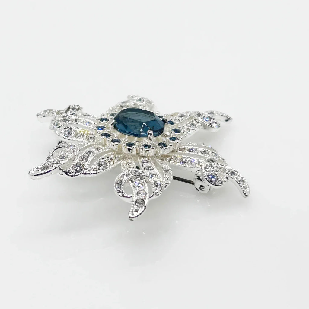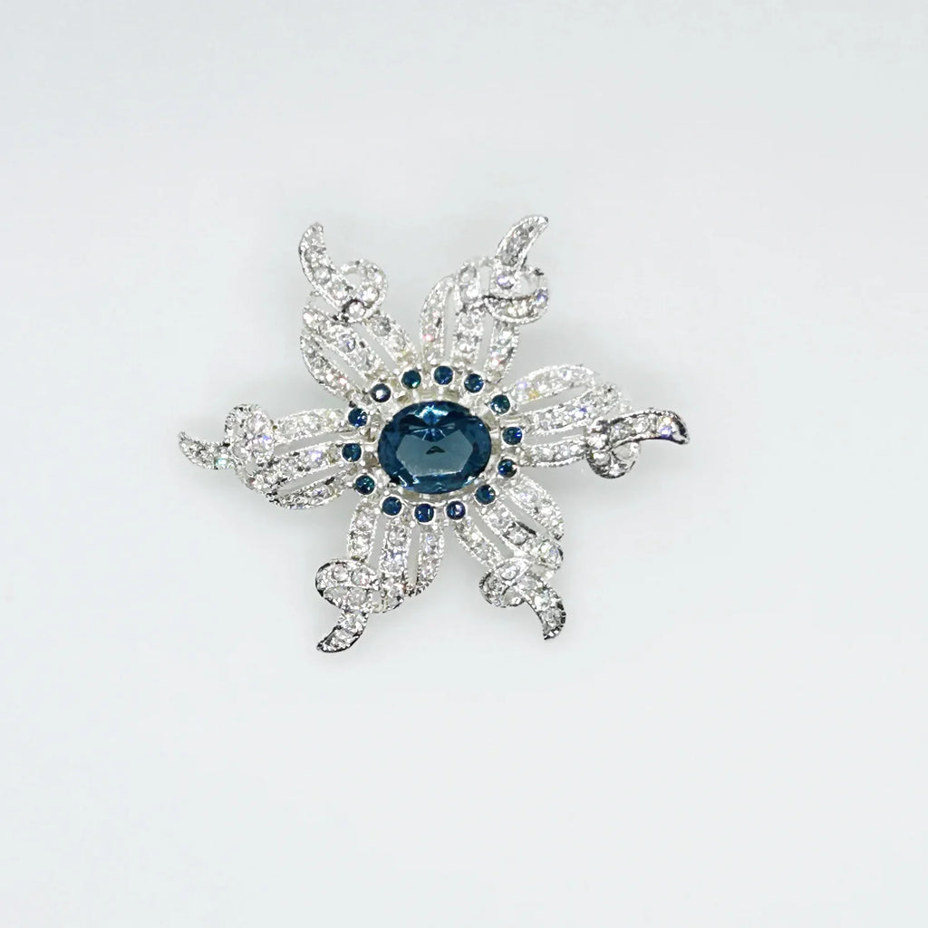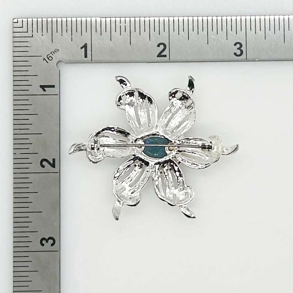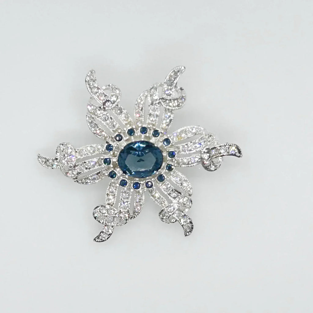 Vintage Signed Roman Rhinestone Flower Brooch Pin, Silver Tone, 2". It has blue open back stone in the center surrounded by smaller blue stones, and rhinestone studded petals.