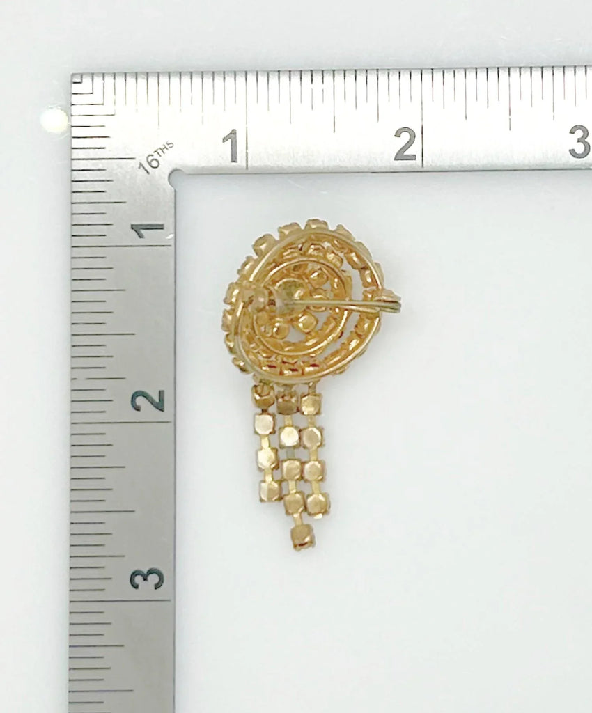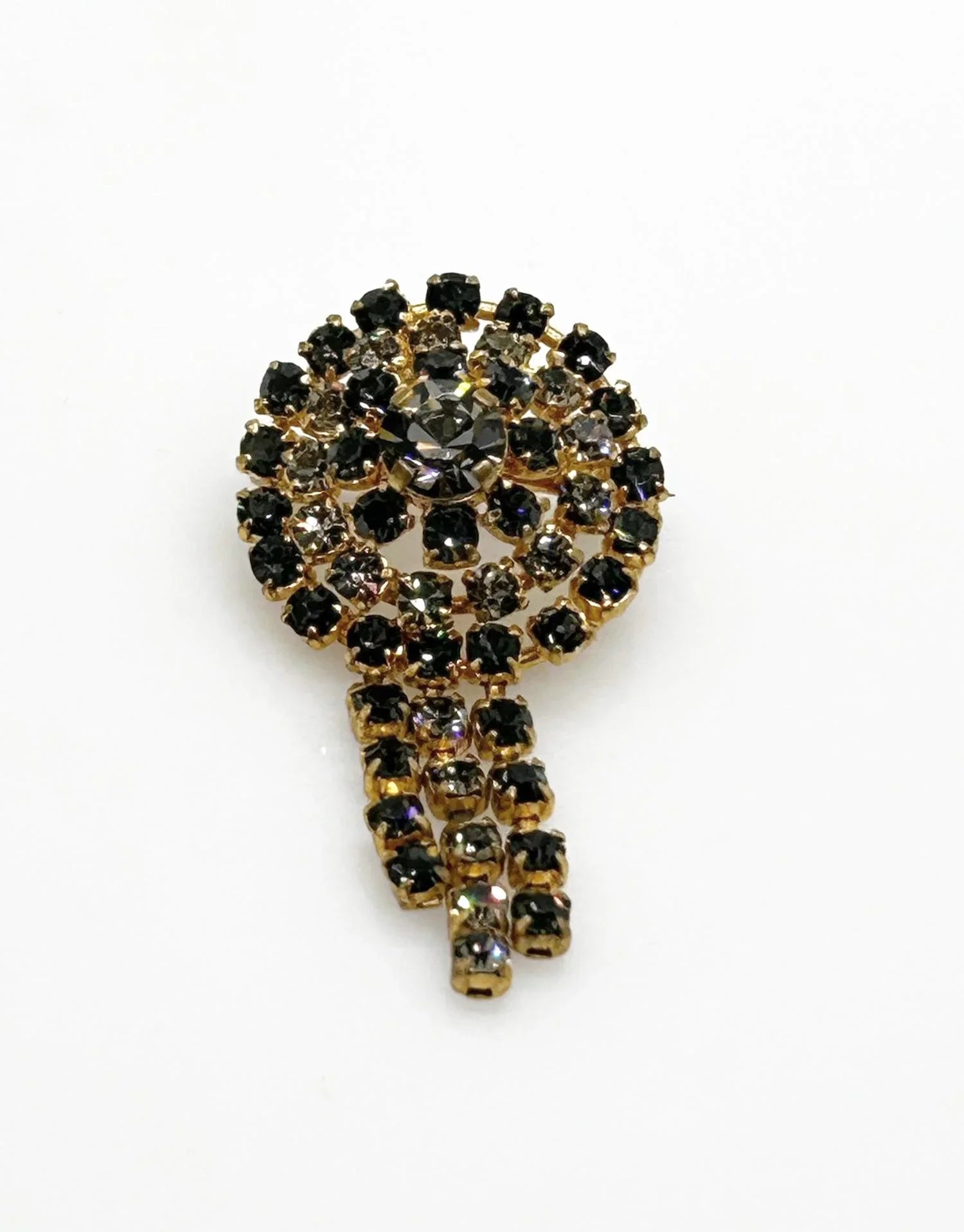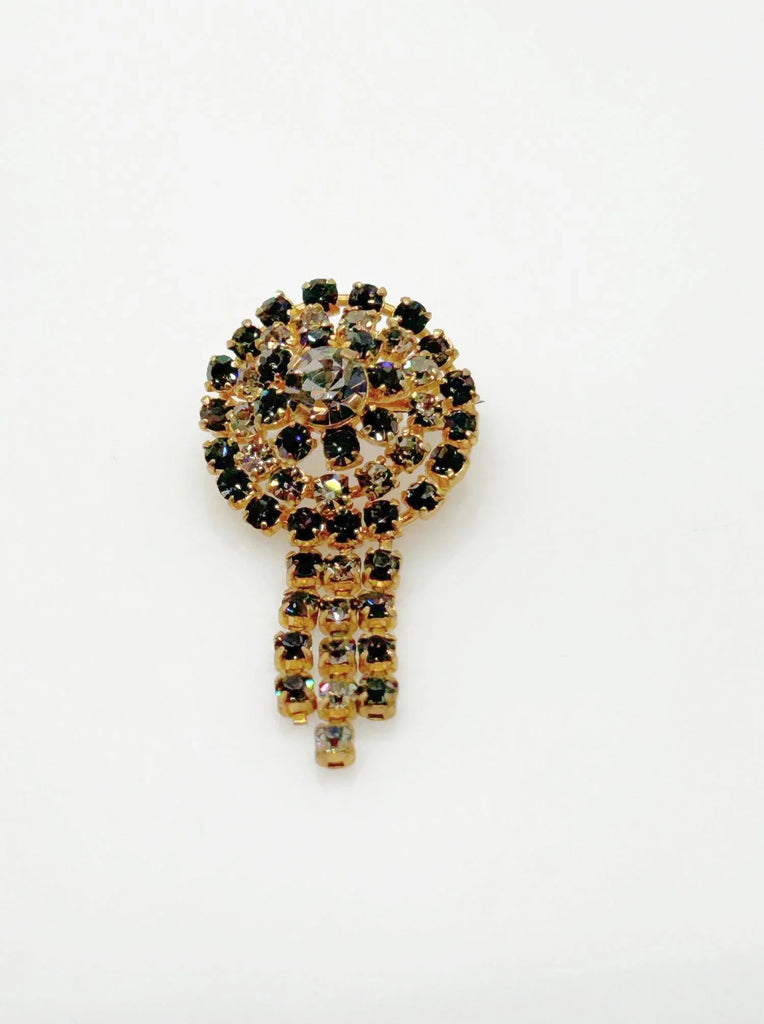 This is a charming vintage rhinestone brooch made of four rings of increasing sizes, arranged in a triangular domed design. It has three dangles flowing from that. Each level alternates blacks and gray. Its a great accessory and can add that needed pizzazz on a Monday or anytime. It measures 2" long and is in excellent condition.