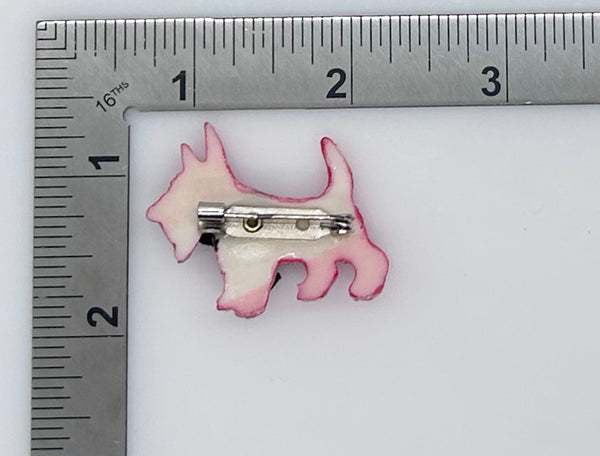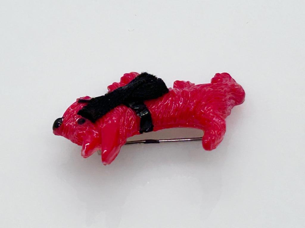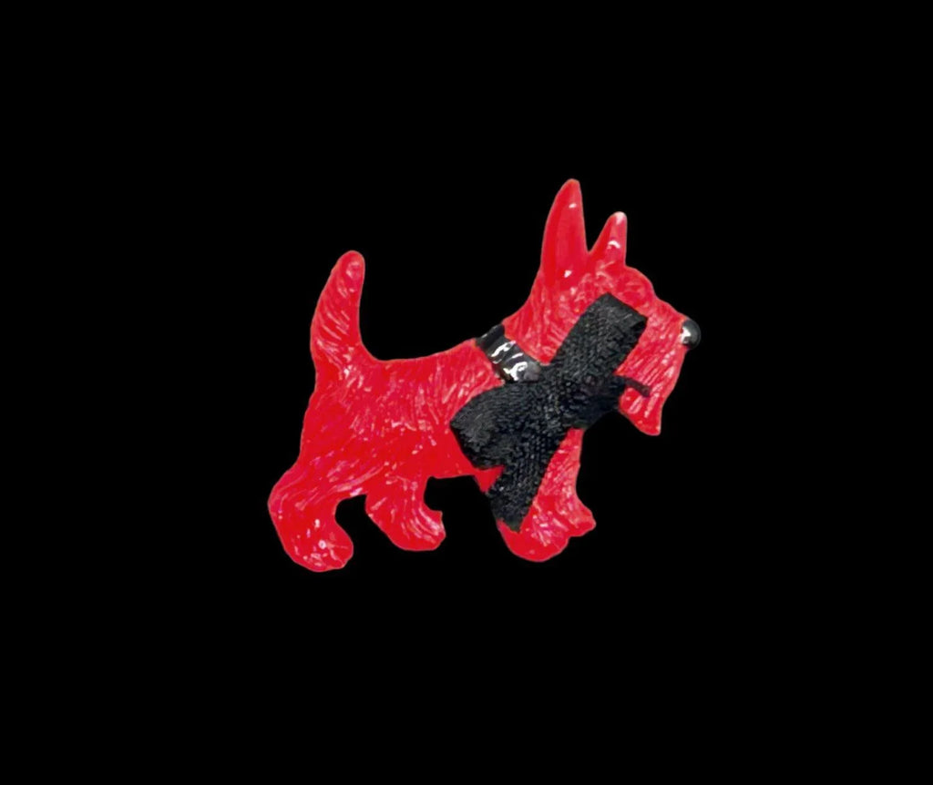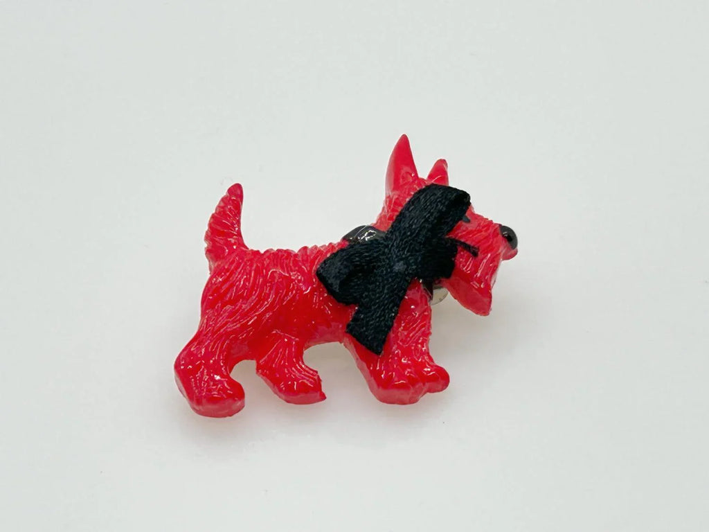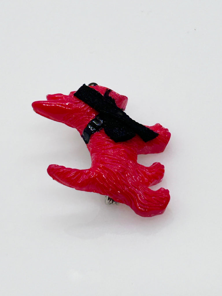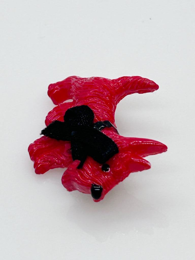 Adopt this captivating and unusual Scottie Dog Brooch, crafted in a bold red hue with a lavish black ribbon bow adorning its neck. Measuring 1.25" in width, it is in impeccable condition. His black collar and nose complete the look. White spots in photos ar light reflecting off the glossy finish of the pin.Elevate your style with this striking and distinctive Scottie Dog Brooch. Crafted in a vibrant red color with a luxurious black ribbon bow accent, this piece exudes sophistication. Measuring 1.25" wide and in pristine condition, it's an exquisite addition to any outfit.