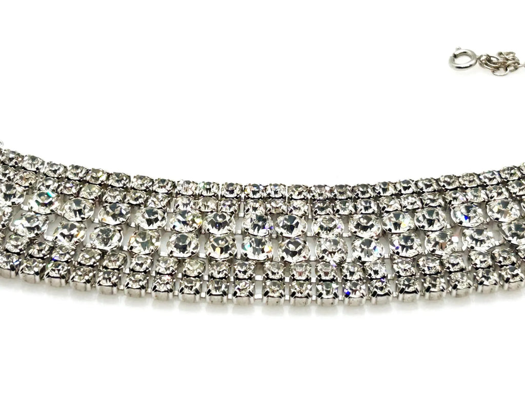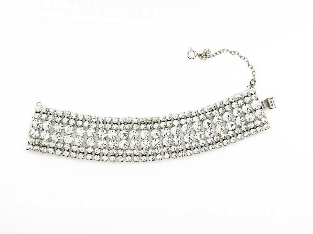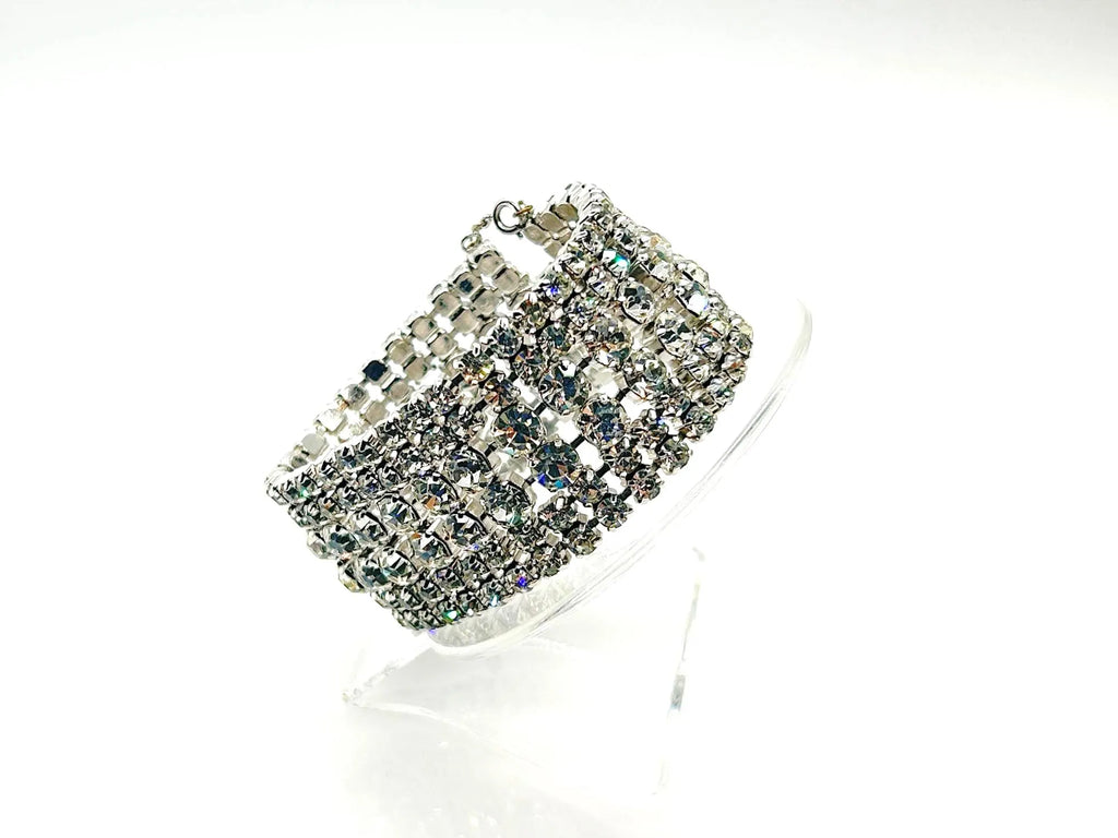 Make your statement with this dazzling vintage rhinestone bracelet! This stunning piece measures approximately 7 inches in length and 1.25 inches in height, ensuring a stunning presence on your wrist. The bracelet boasts a secure and reliable push clasp, reinforced with a safety chain for peace of mind. Adorned with brilliant, clear rhinestones, each one is meticulously prong-set for lasting shine. The design features a captivating arrangement: two tiers of shimmering round stones grace the top and bottom rows, while the center rows sparkle with larger, more prominent stones. This exquisite bracelet is more than just an accessory; it's a statement of timeless elegance. And as a special bonus, enjoy complimentary shipping!. Free Shipping