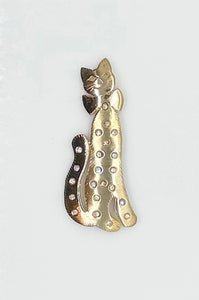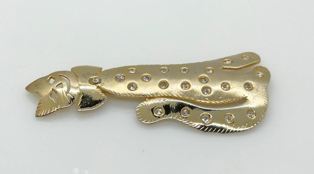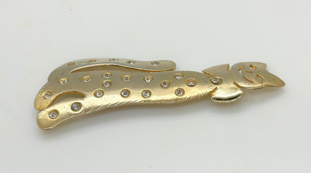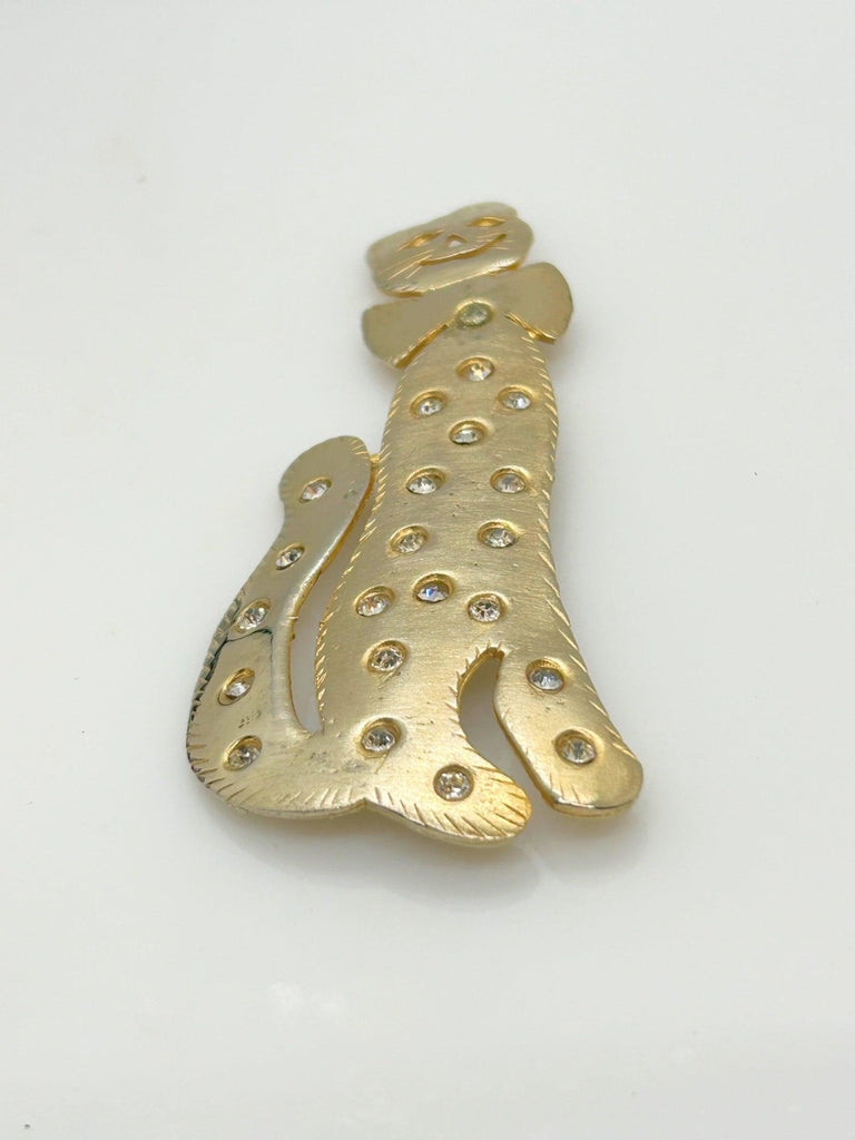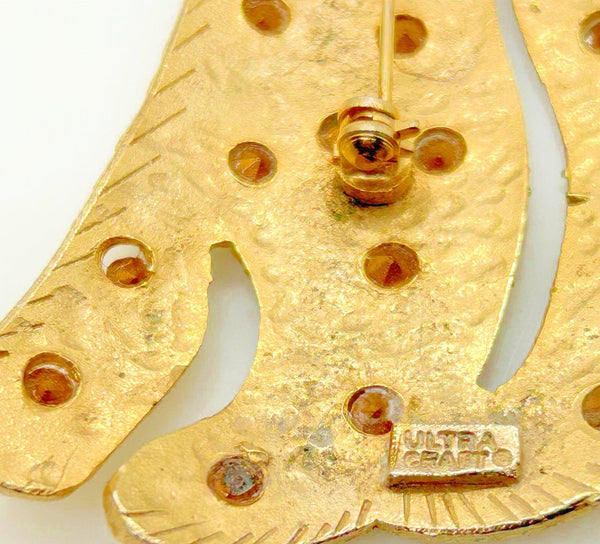 Get ready to add some playful pizzazz to your outfit with this tall kitty cat brooch! Measuring 4 1/2" tall, this gold tone cutie is signed Ultra Craft and studded with bright white rhinestones. (Purr-fect for adding a touch of glam to any look!) Turn heads and show off your unique style with this gold tone kitty cat pin! Standing tall and measuring 4 1/2", this little feline is signed Ultra Craft and adorned with dazzling white rhinestones. (Not to mention, it'll add some serious purr-sonality to your ensemble!)