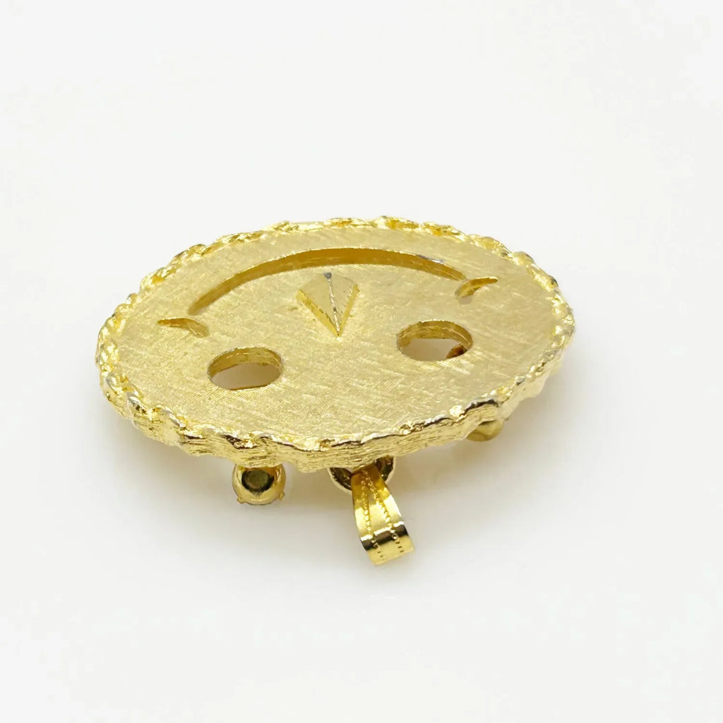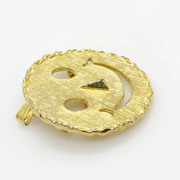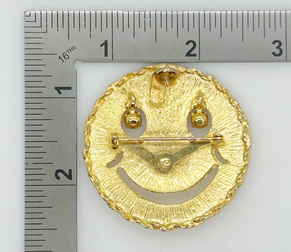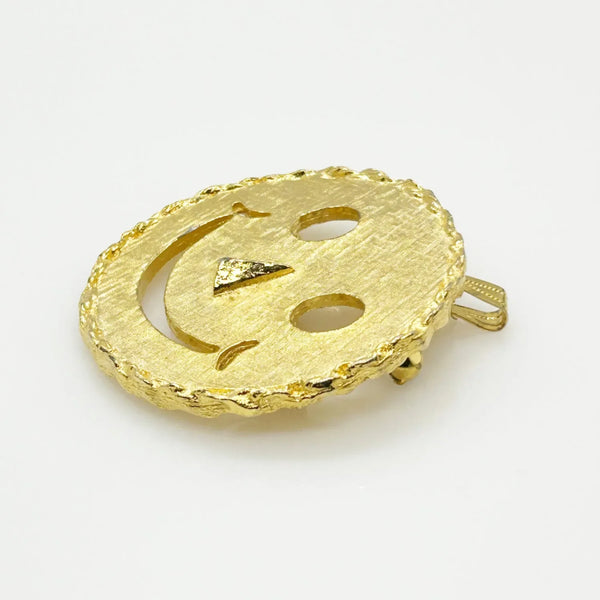 This is definitely a "wow" piece! It is round with textured gold metal, and has a wide open smile and 3-D triangular nose. The eyes have dangling white rhinestones and catch the light. Around the edges of the piece is a rope motif. It measures 2" across and can be worn as either a pendant or a pin brooch.
