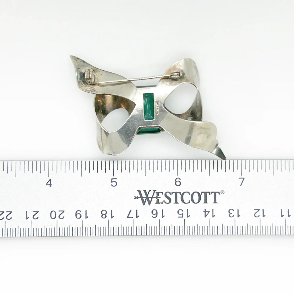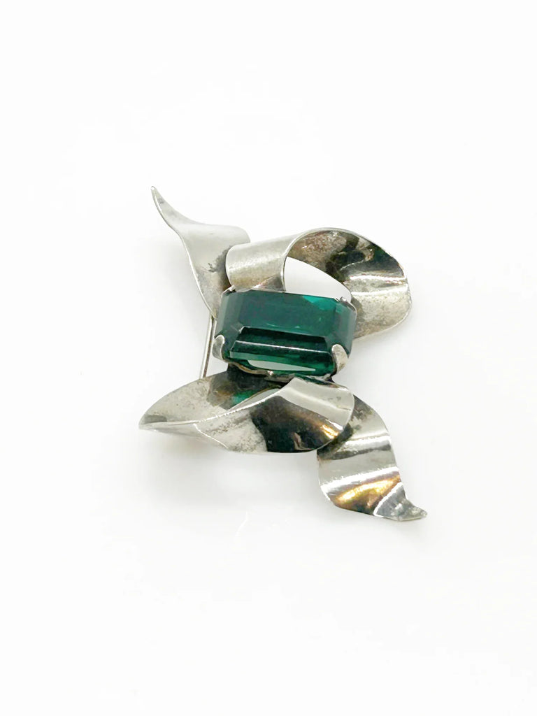 Vintage Sterling Silver Bow Brooch with Emerald Cut Deep Green Stone