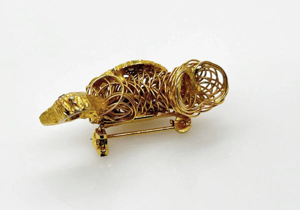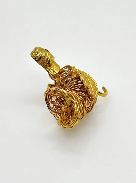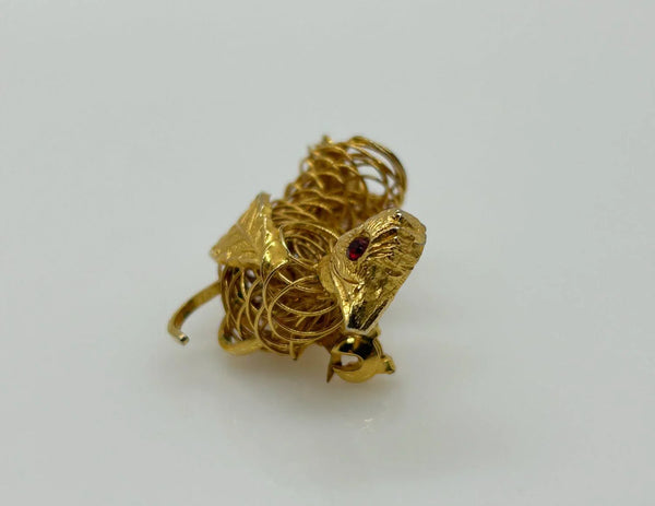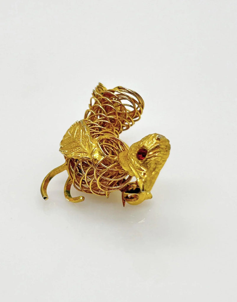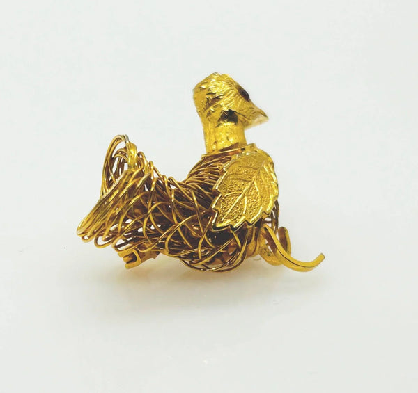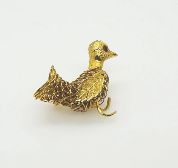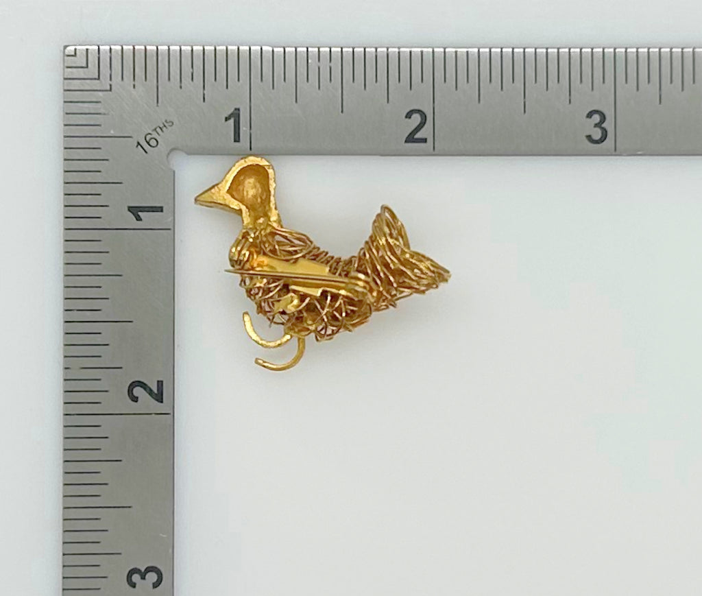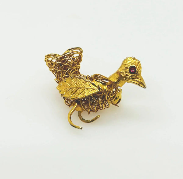 This vintage brooch shows exceptional craftsmanship in its construction of gold tone wire, with a detailed leaf showing as a wing, and a textured head with glittering red eye, and measures 1.75" wide.