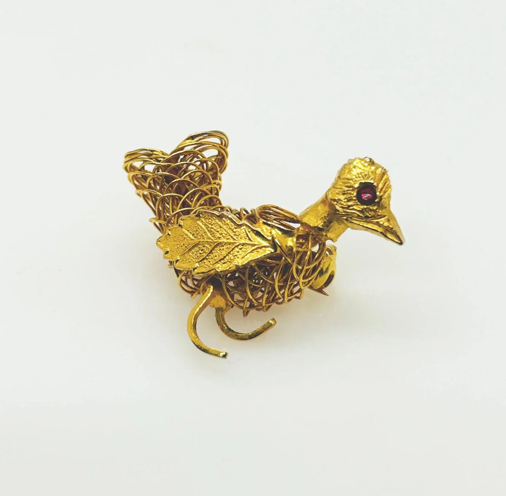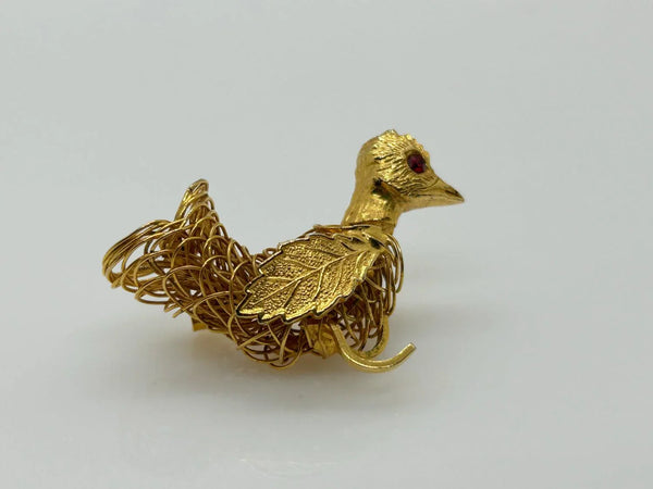 Sparkle and shine with this vintage bird brooch! Carefully crafted with gold tone wire, it features a delicate leaf wing and a textured head with a mesmerizing red eye. A true work of art that will add a touch of elegance to any outfit.